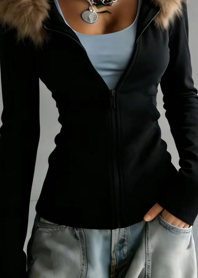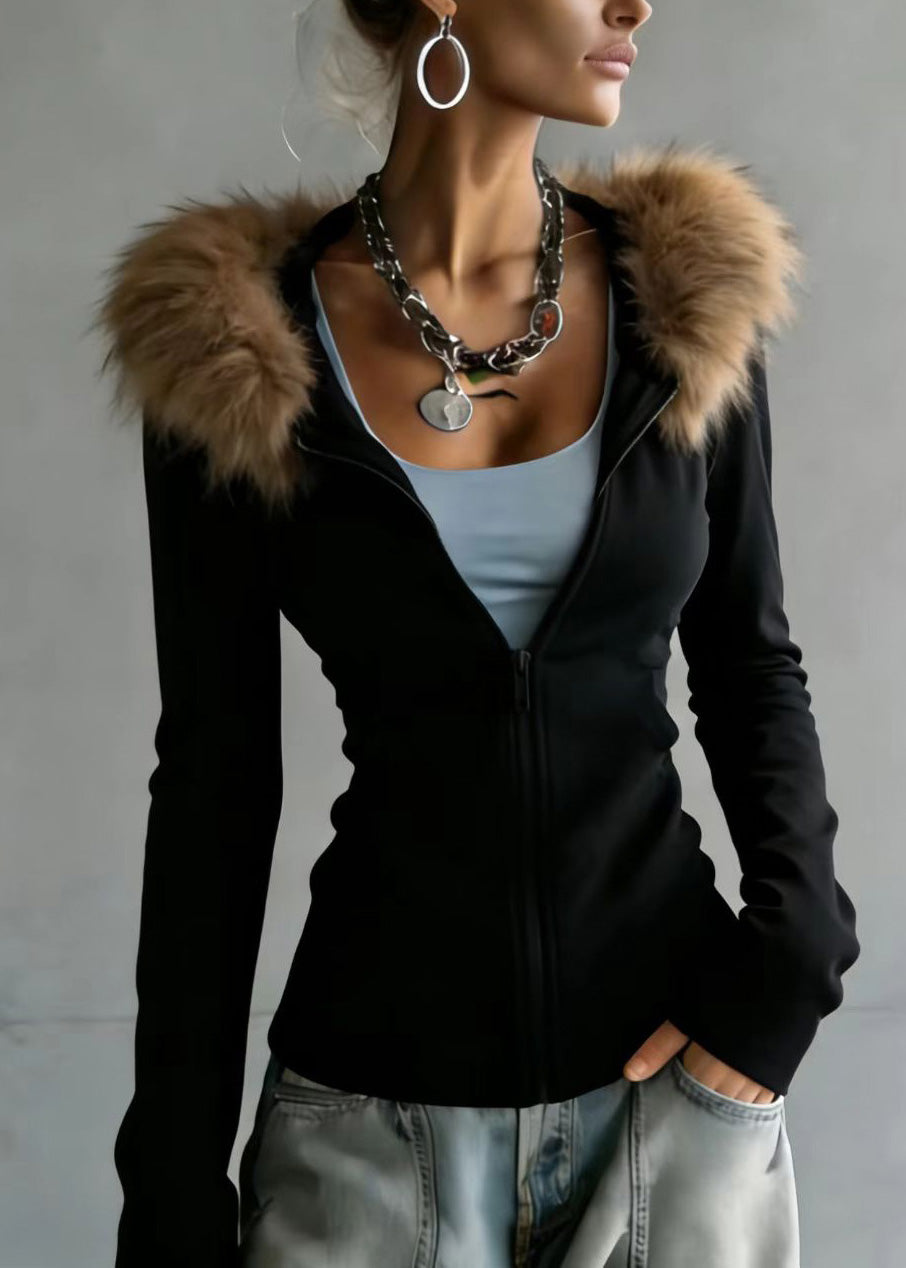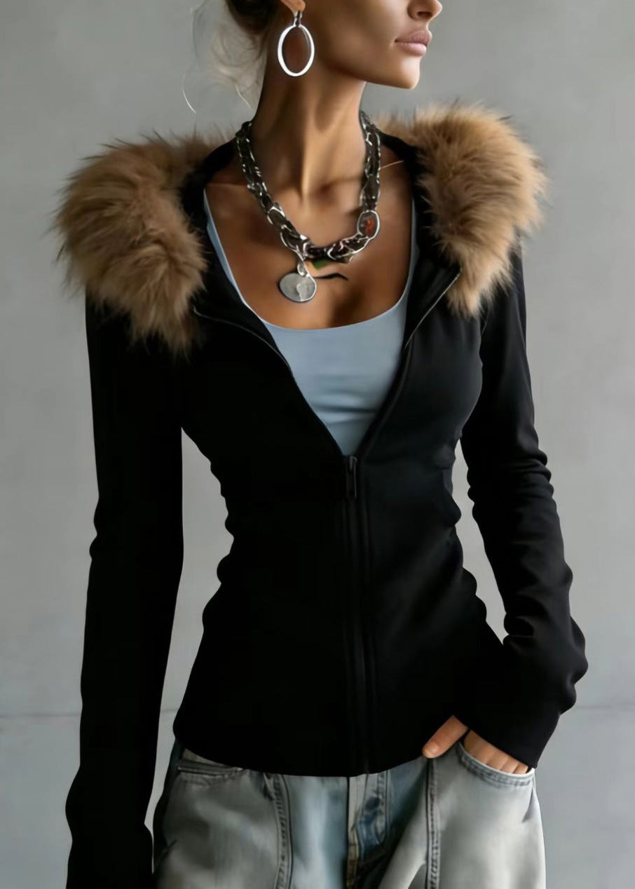 Italian Black Fur Collar Patchwork Cotton Hooded Coats Spring