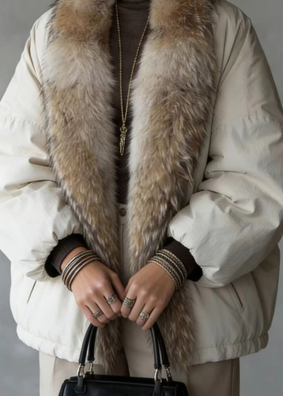 Chic Beige V Neck Fuzzy Fur Fluffy Tops Lantern Sleeve