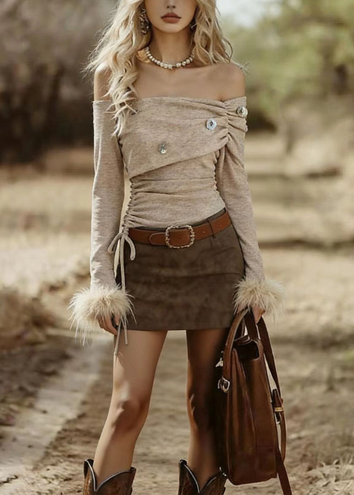 Stylish Khaki Asymmetrical Drawstring Fur Patchwork Cotton T Shirt Spring