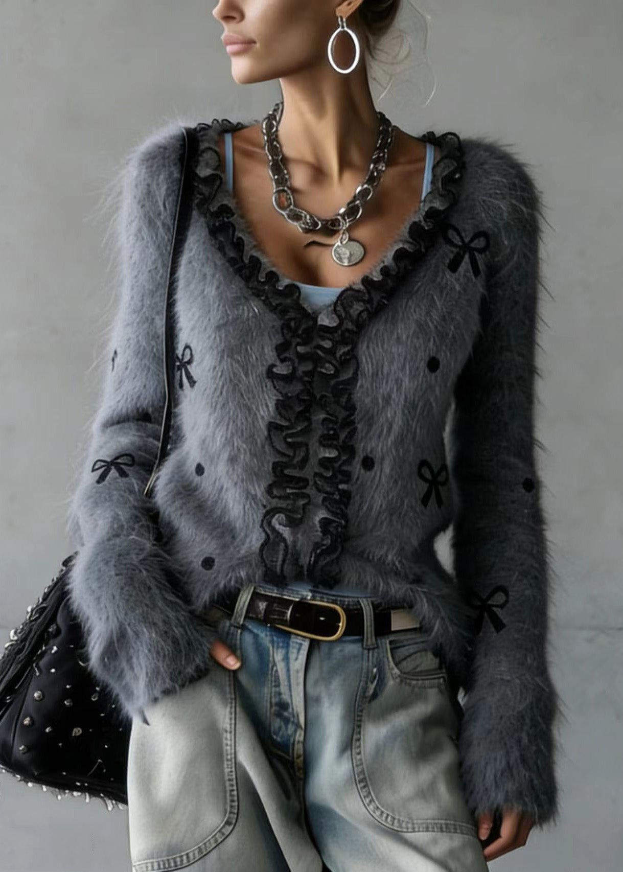 Women Grey Ruffled Patchwork Faux Fur Fluffy Knitted Top Spring