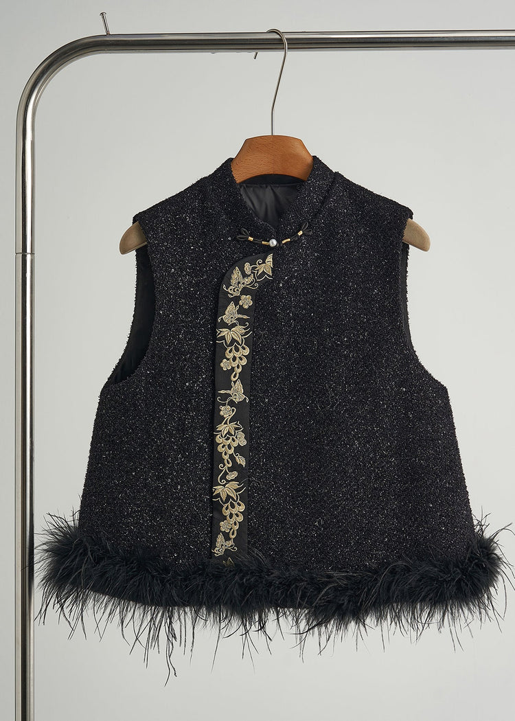 Style Black Embroidered Patchwork Feather Woolen Vests Fall