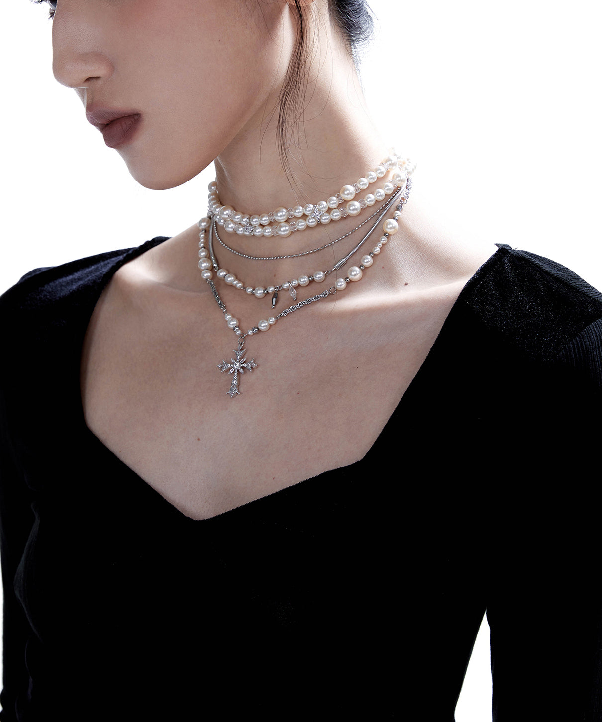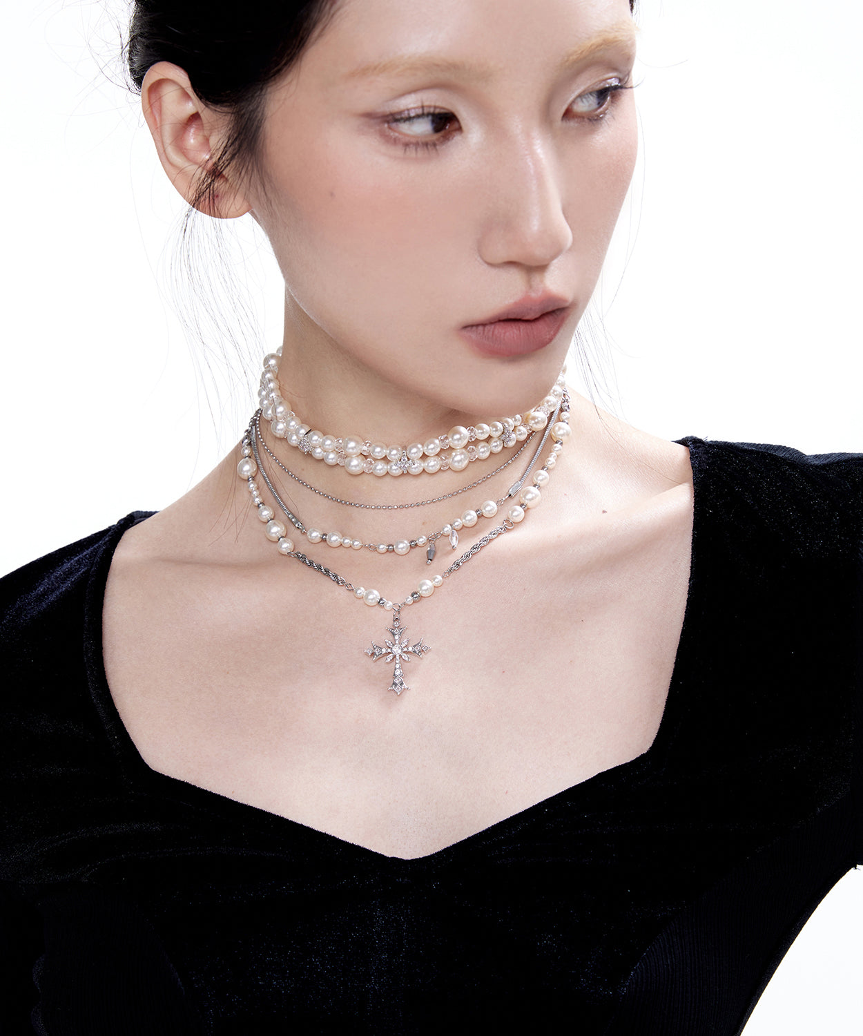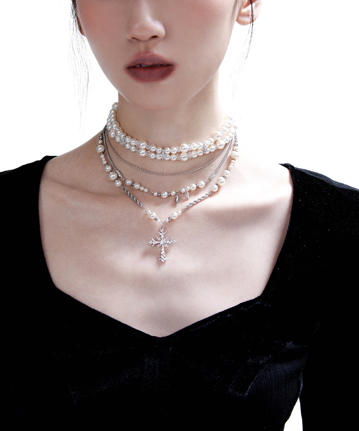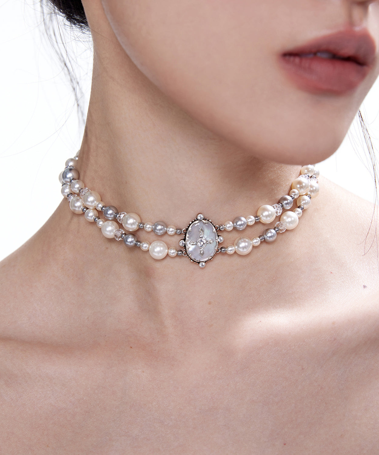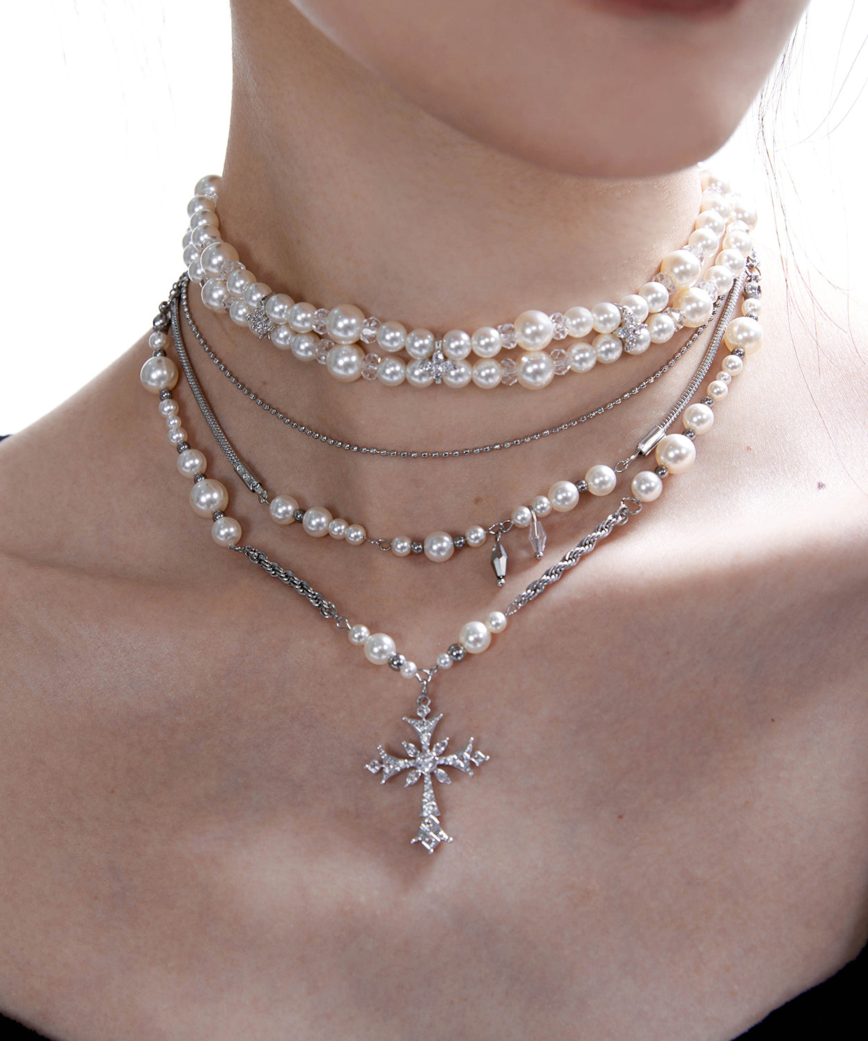 Chic Pearls Double Cross Double Layered Alloy Choker