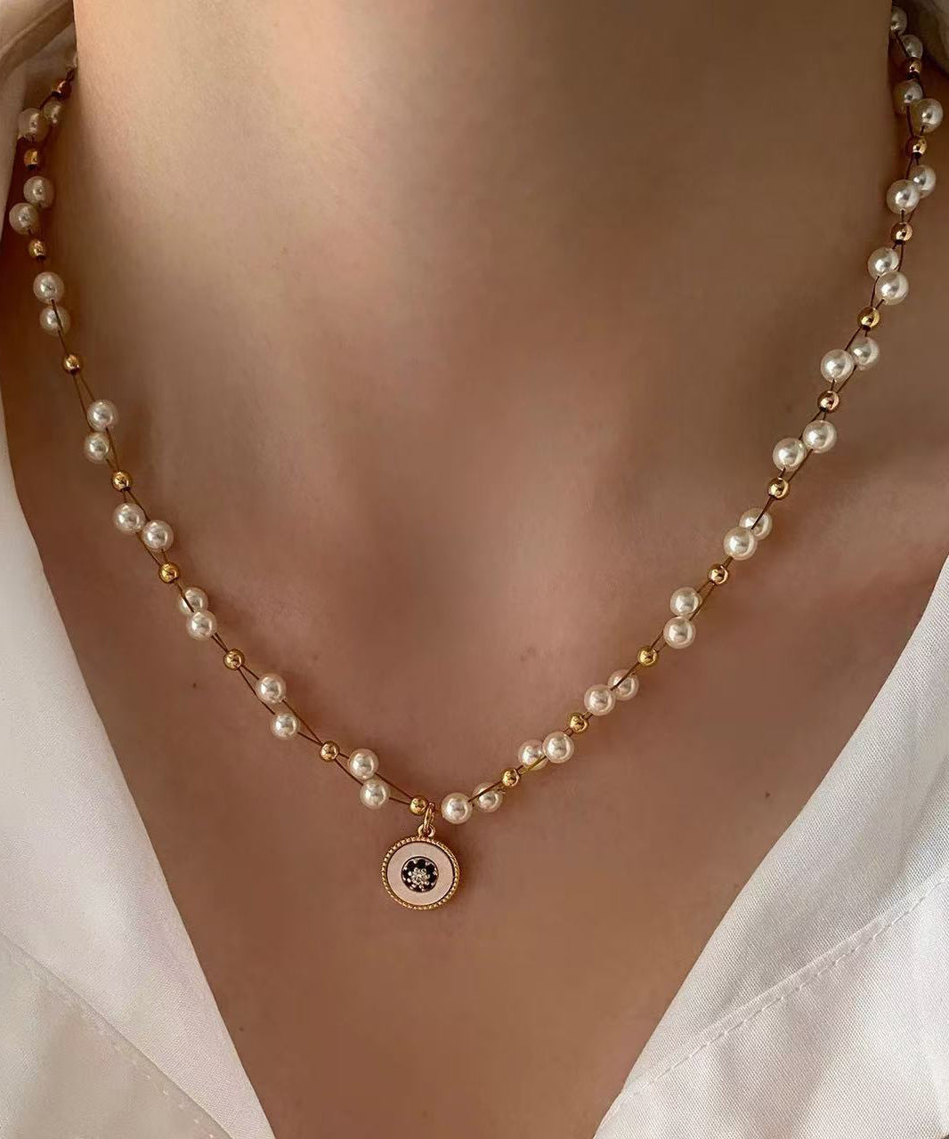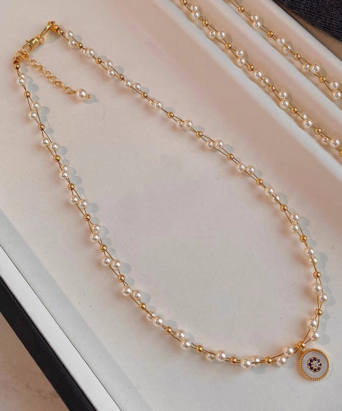 Elegant Pearl Double Layered Gilded Circle Pendant Necklace