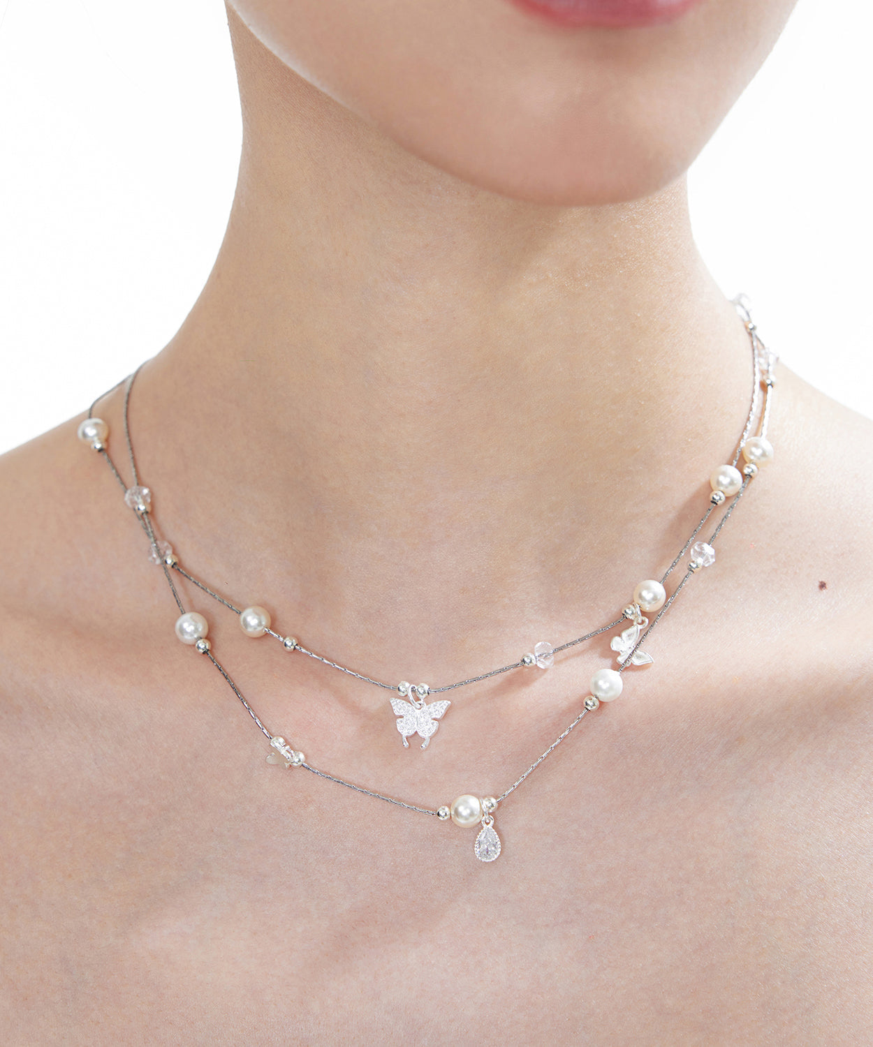 Original White Butterfly Crystal Pearl Double Layered Adjustable Silver Necklace