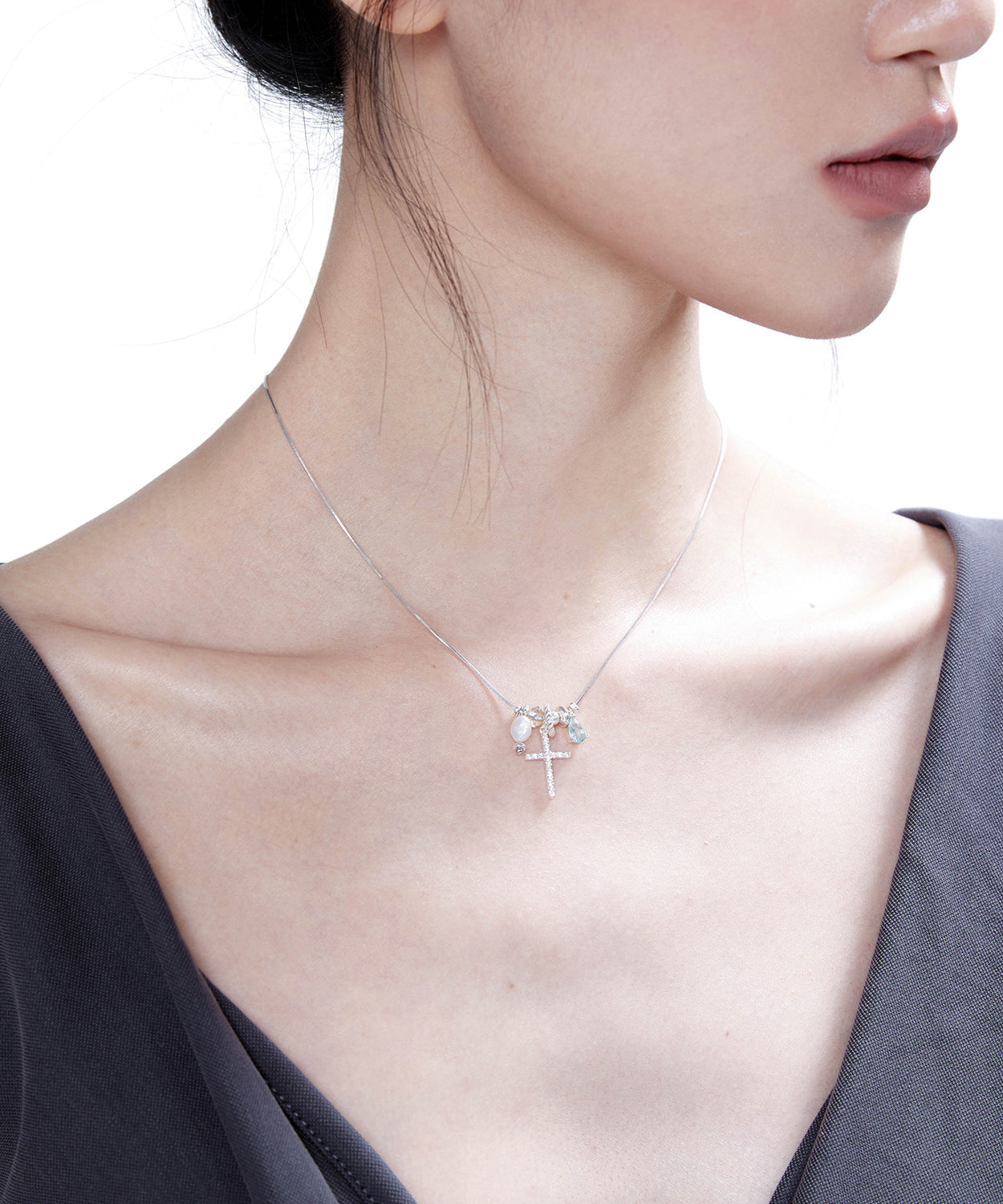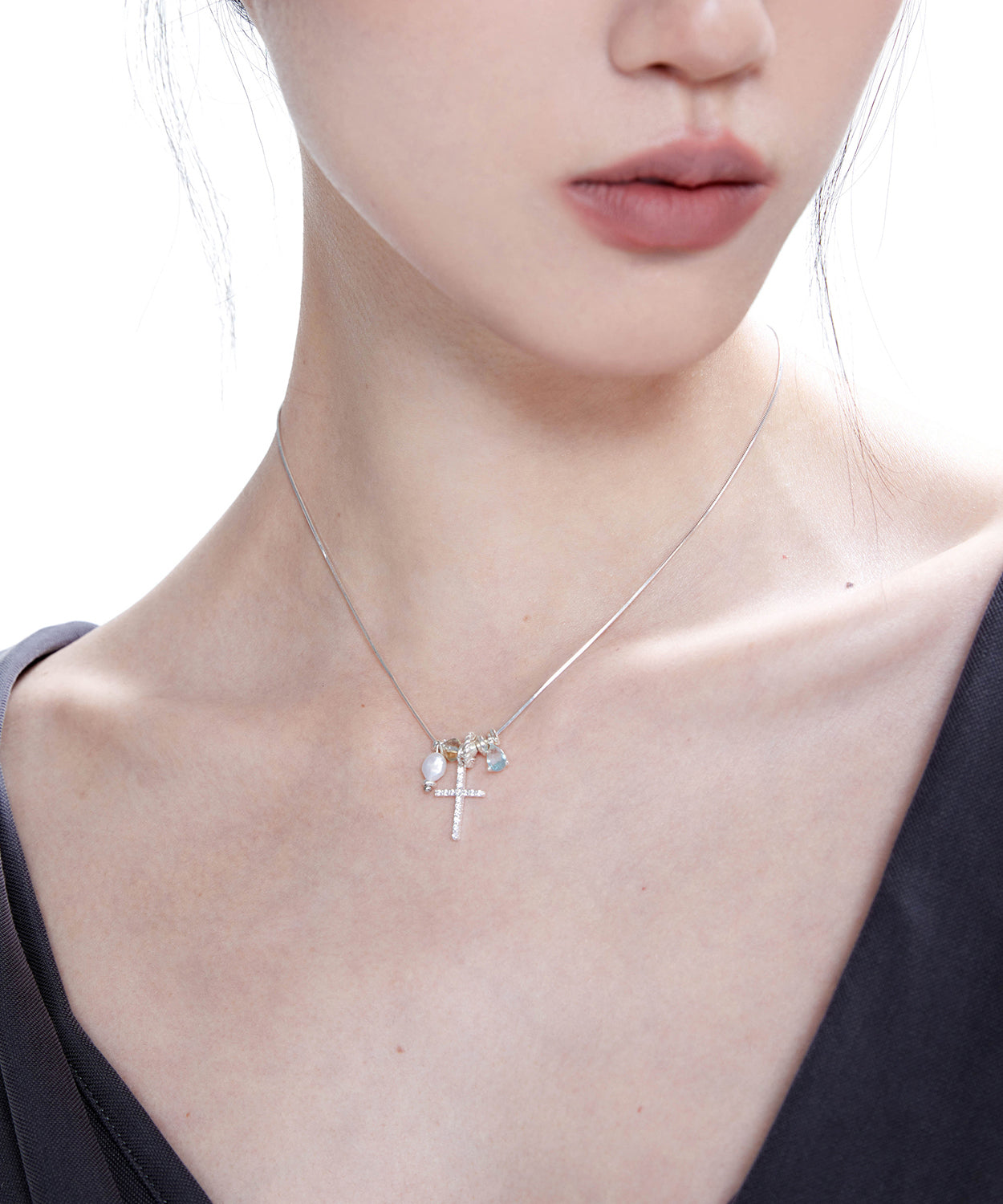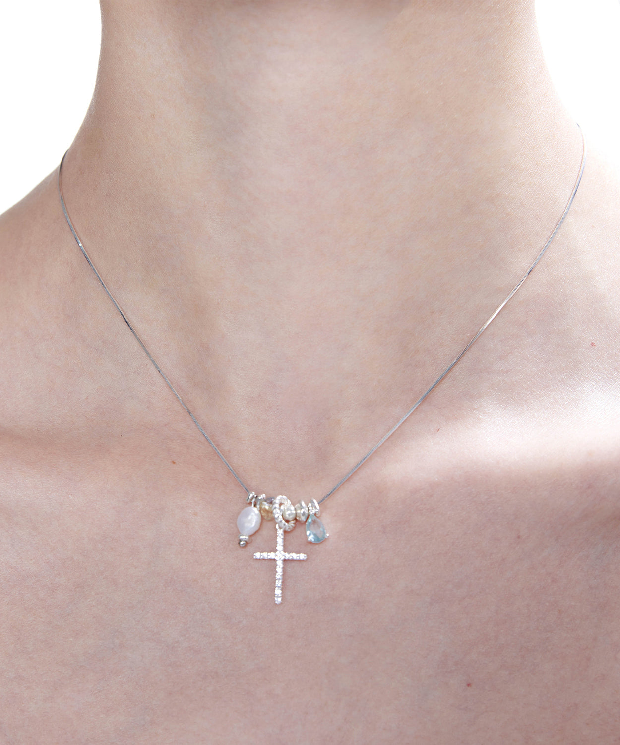 Style Blue Zircon Cross Pearl Adjustable Silver Pendant Necklace