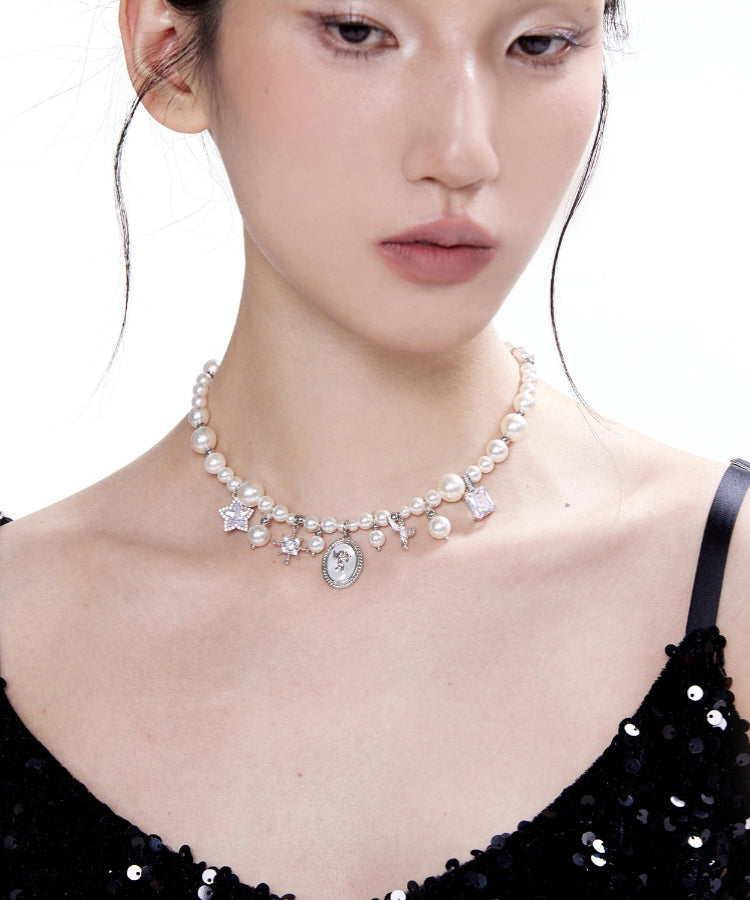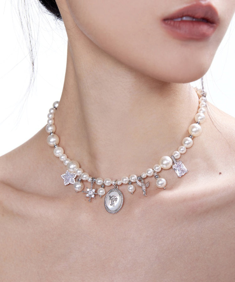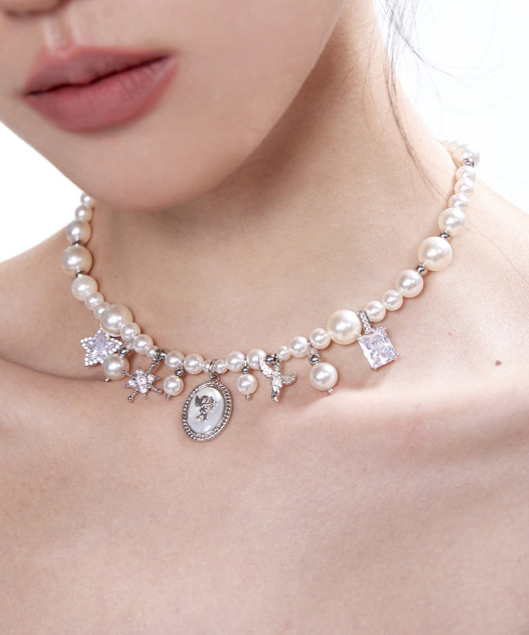 Stylish Pearl Angel Zircon Silver Plated Pendant Choker