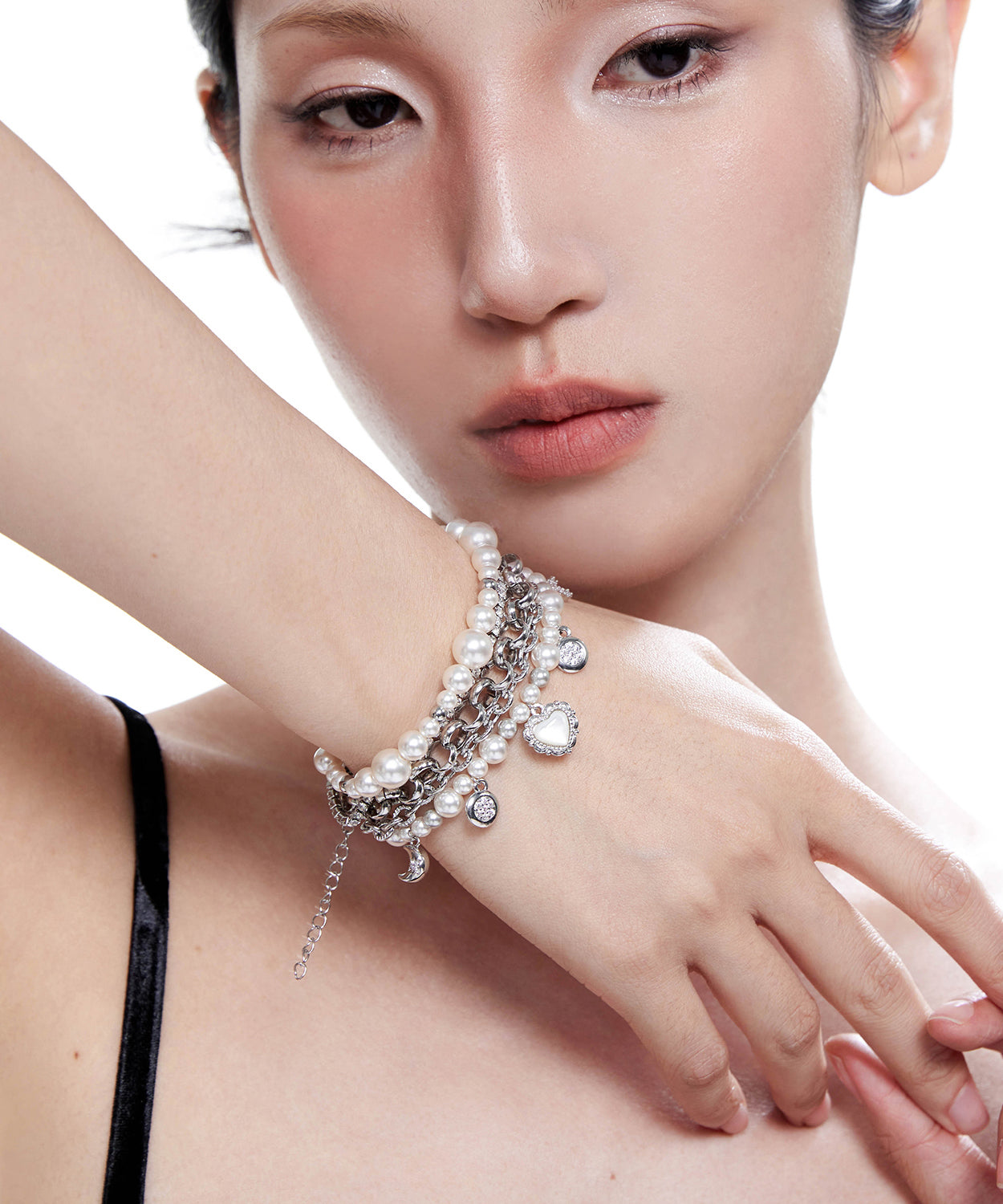 Unique White Pearl Love Heart Pendant Multi Layered Alloy Bracelet