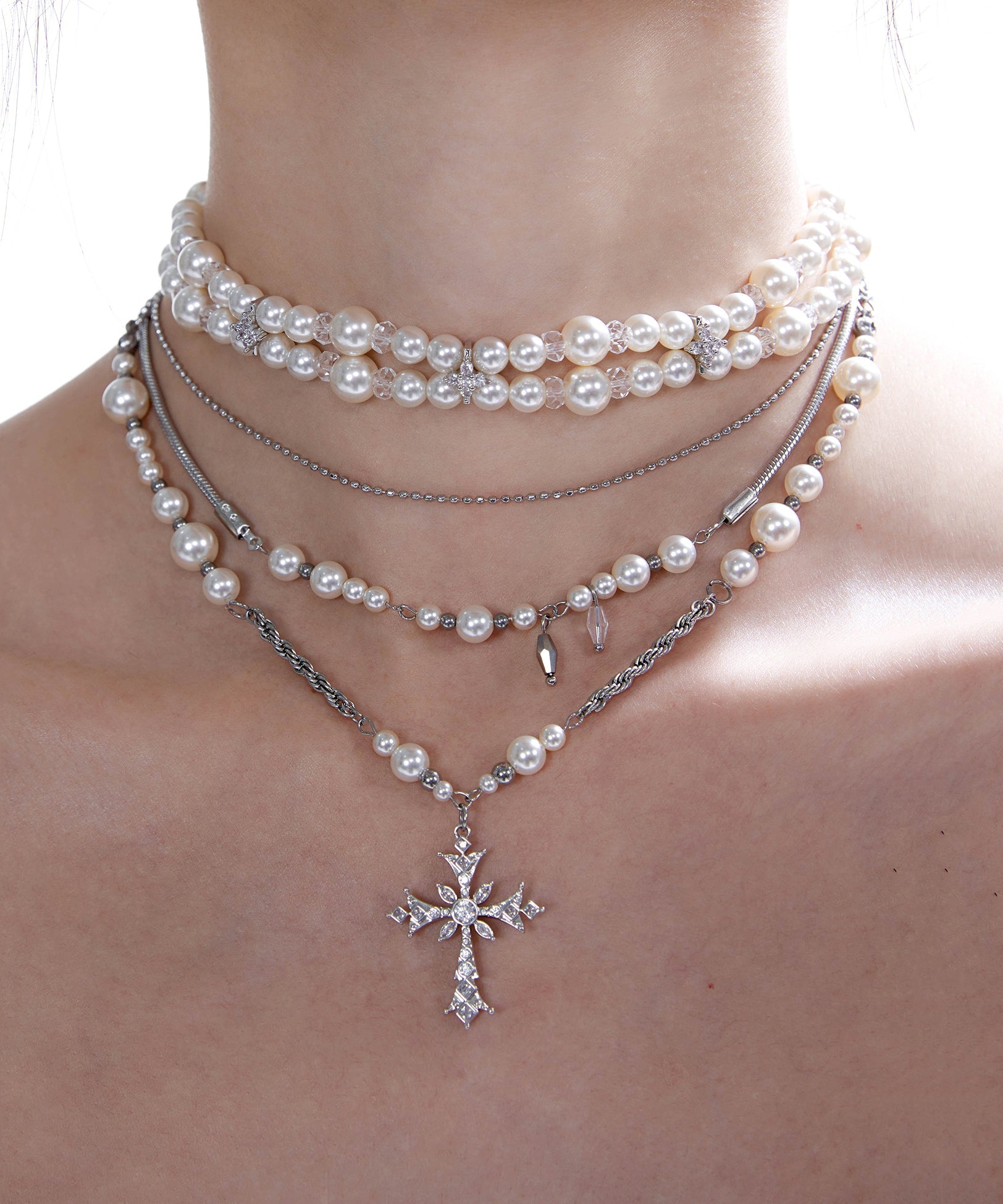 Vintage Pearl Cross Two Piece Set Alloy Layering Pendant Necklace