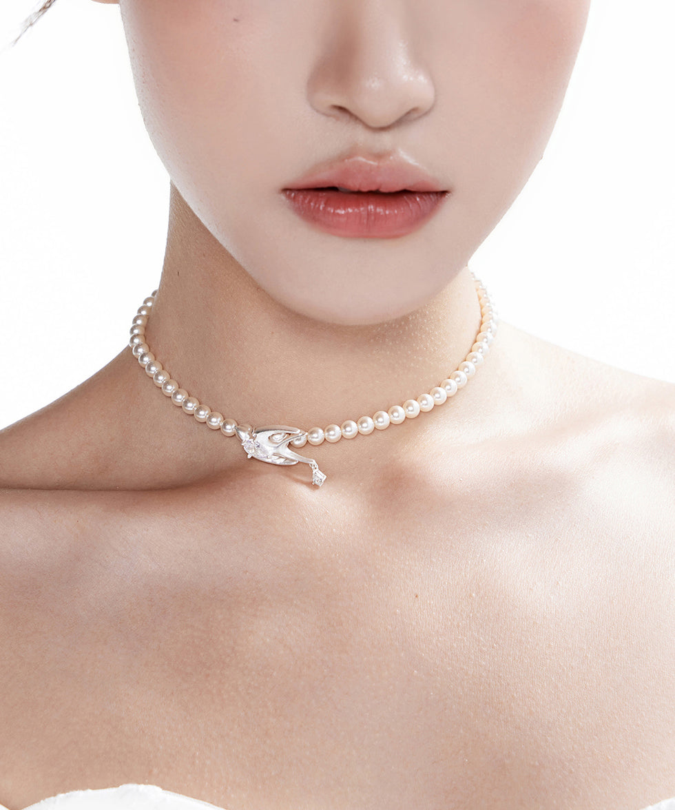 Elegant Pearl Little Bird Zircon Silver Plated Choker