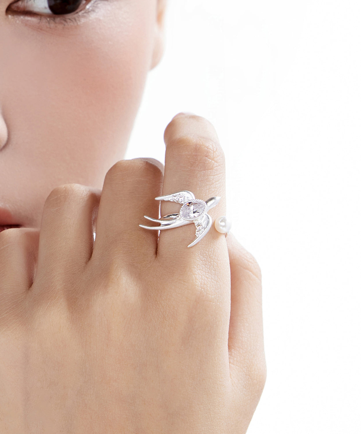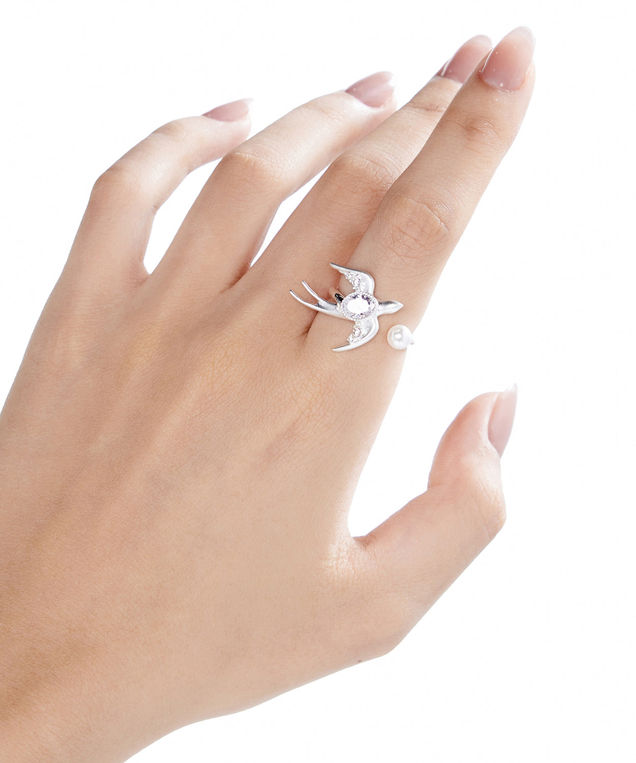 Small Bird Large Drill Pearl Zircon Adjustable Silver Rings