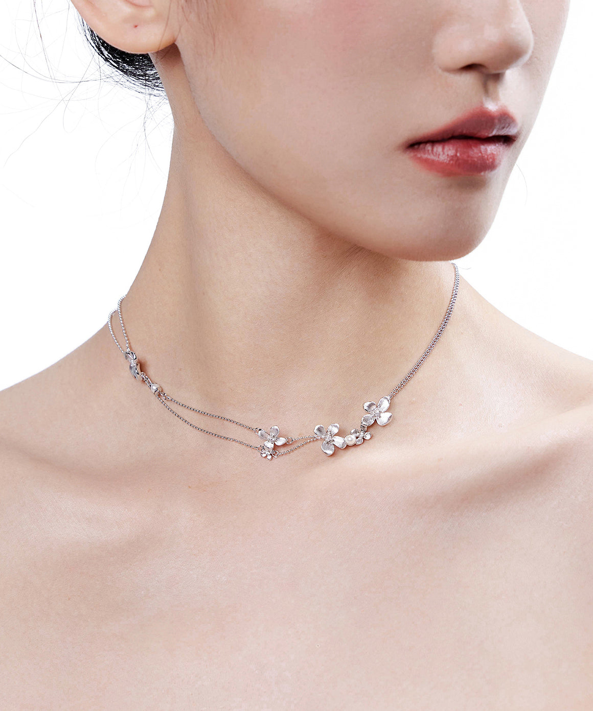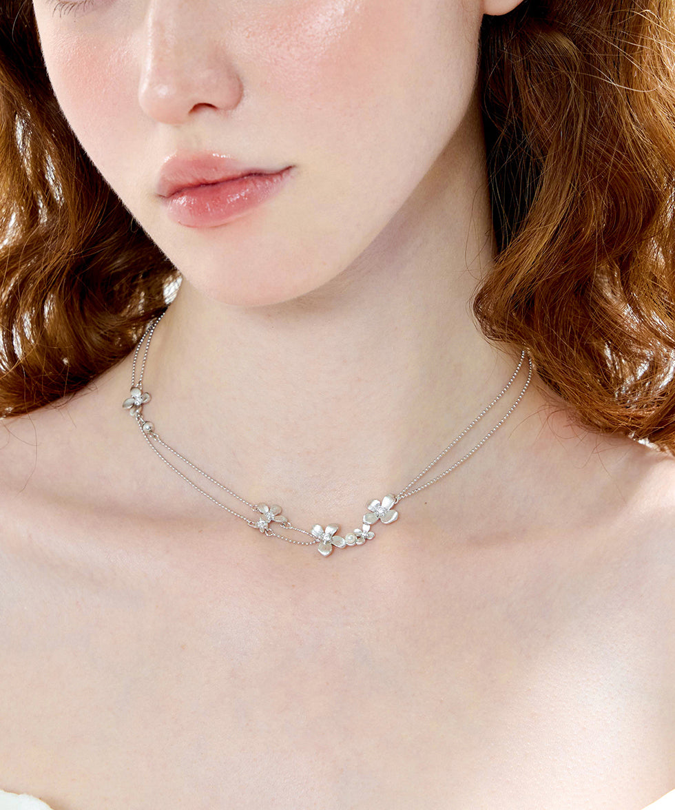 Flower Pendant Crystal Double Layer Chain Silver Plated Choker
