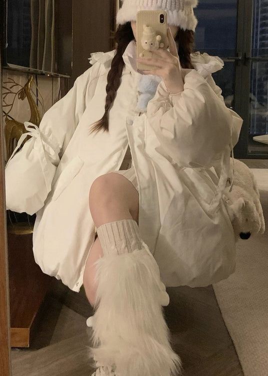 Cute White Hooded Pockets Fine Cotton Filled Jacket Winter