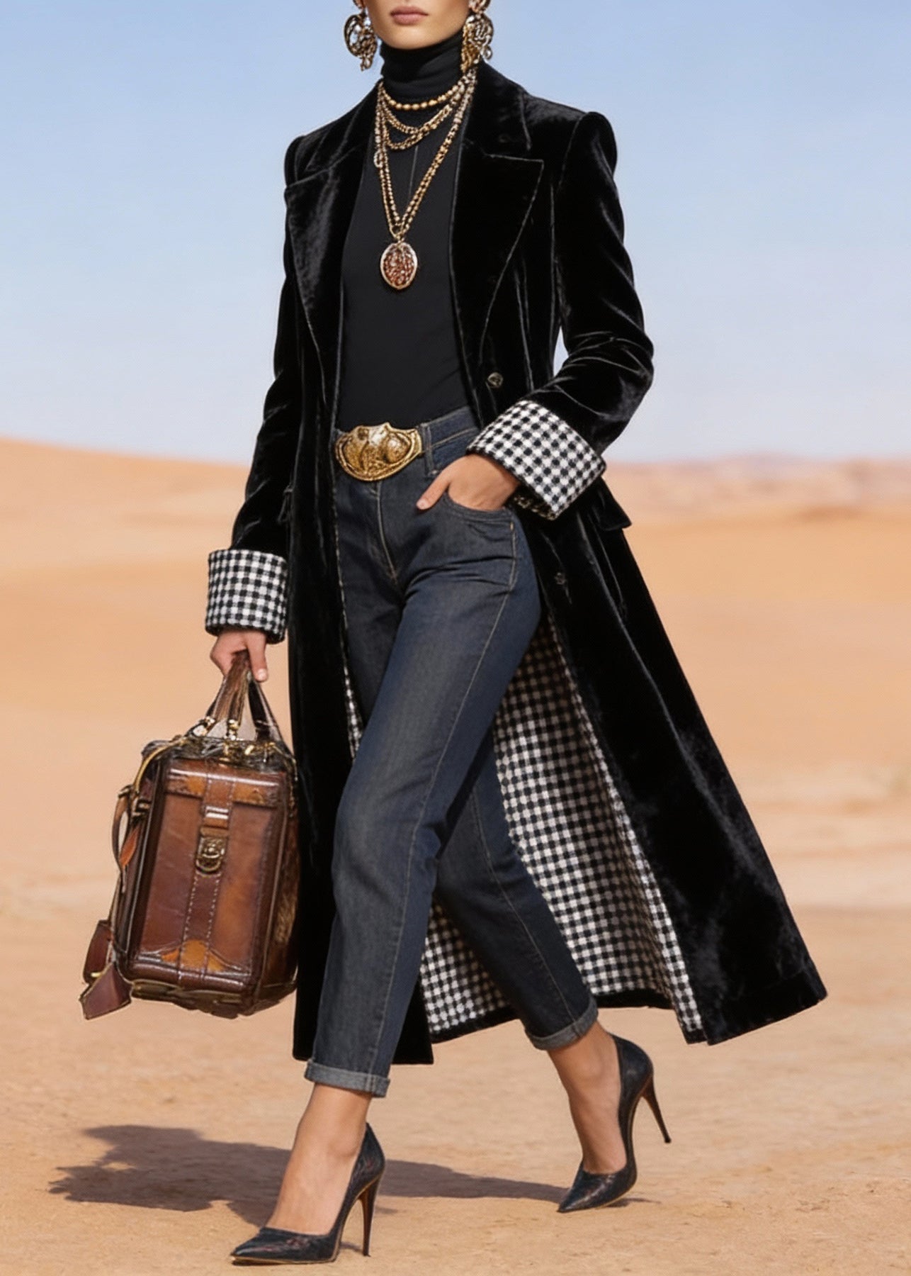 Fitted Black Peter Pan Collar Pockets Velvet Long Coat Spring
