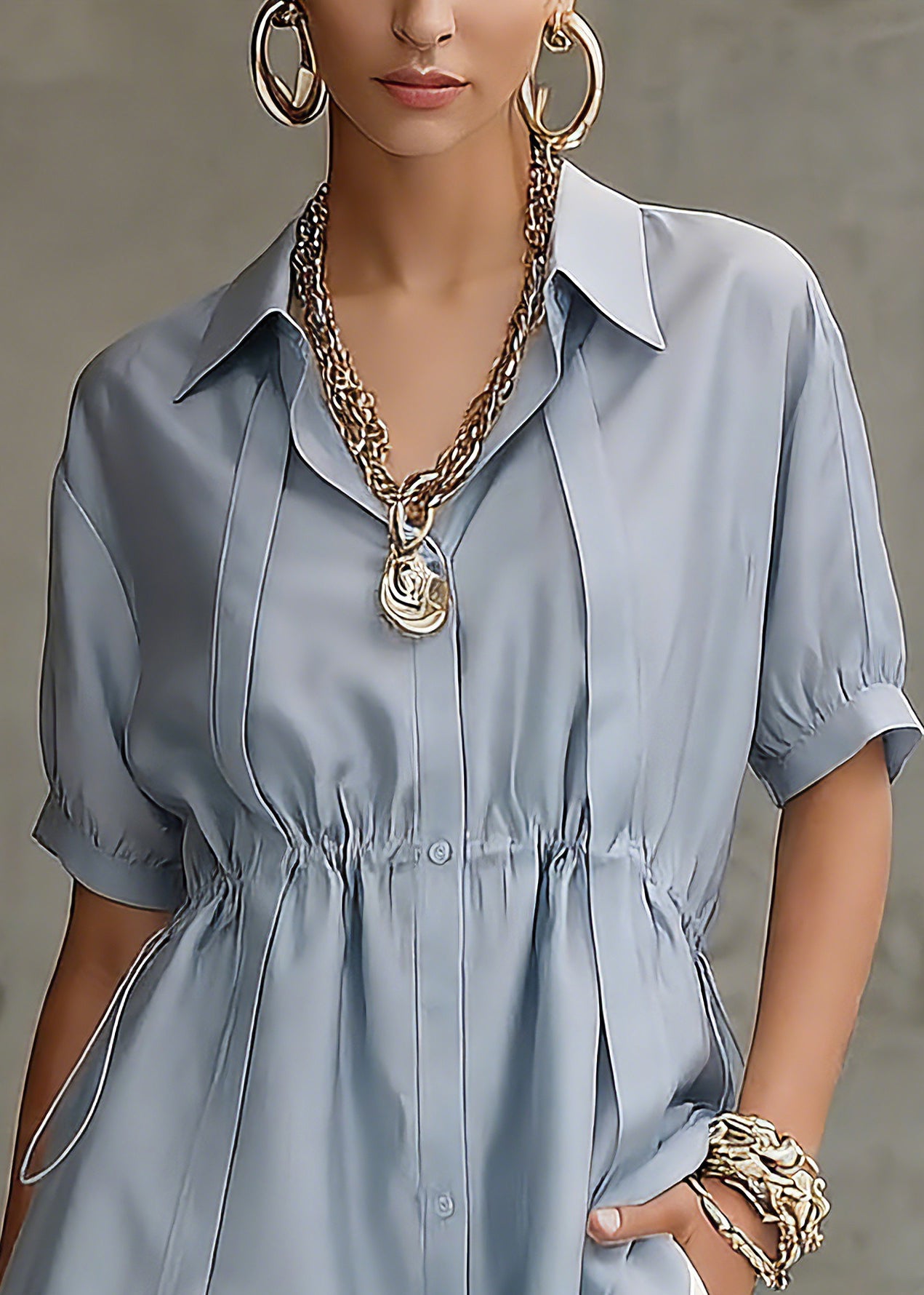 Fine Blue Peter Pan Collar Drawstring Silk Cotton Shirts Short Sleeve