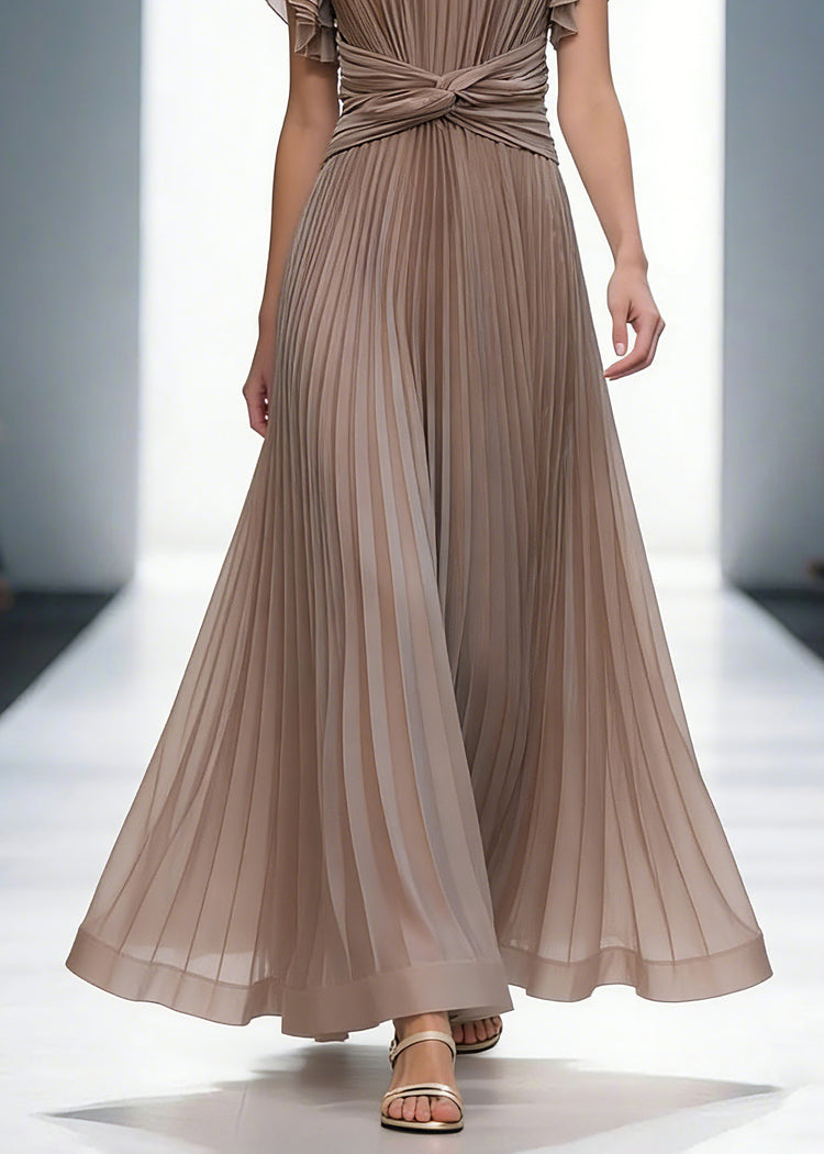 Mocha Elegant Queen Pleated Ruffle Sleeve Cross Waist Maxi Dress