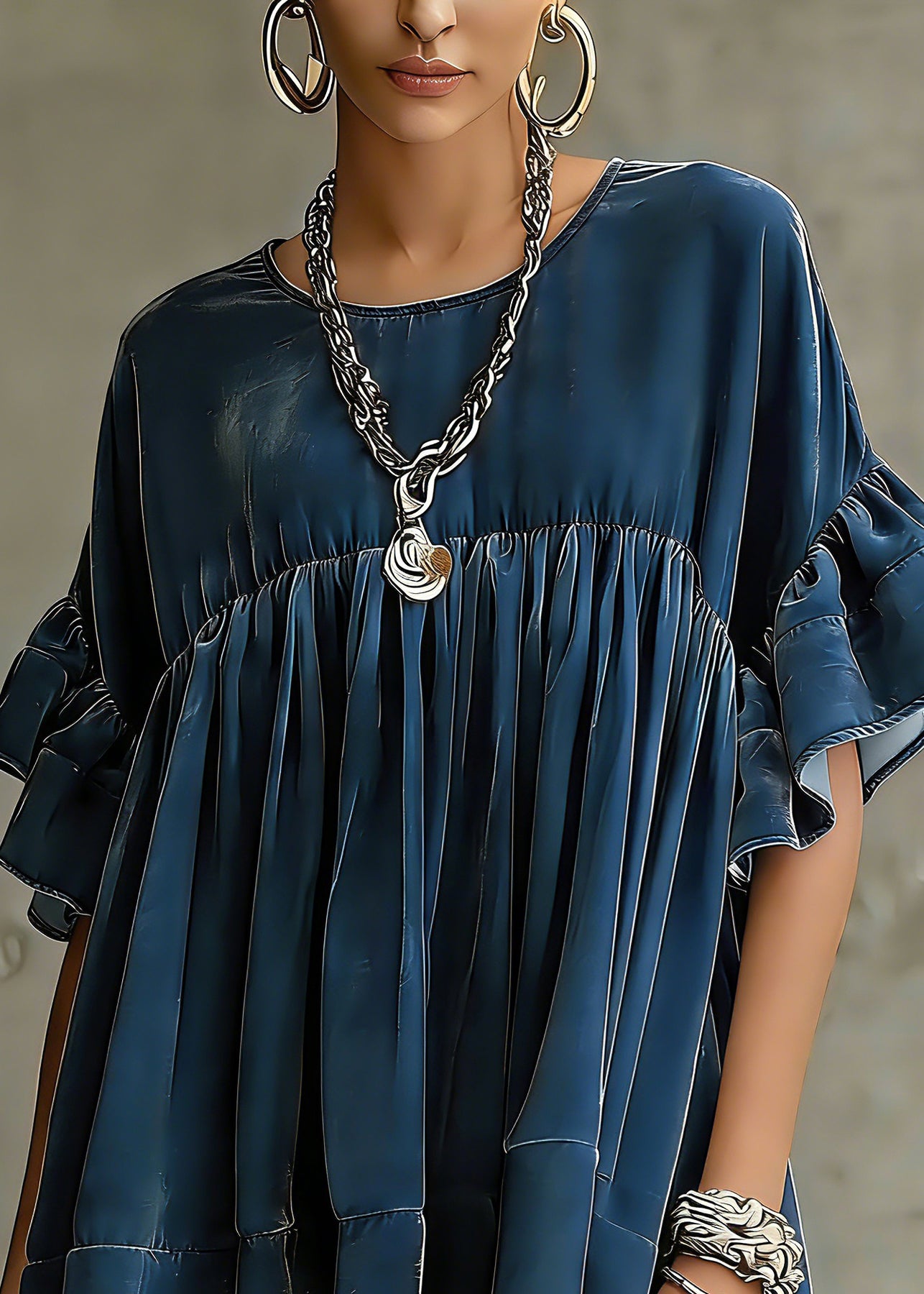 Plus Size Blue Wrinkled Patchwork Velour Short Dress Butterfly Sleeve1