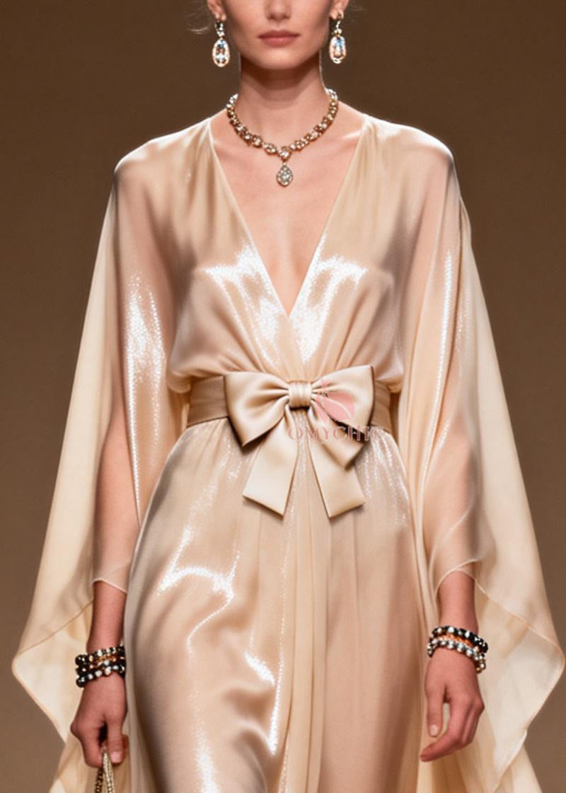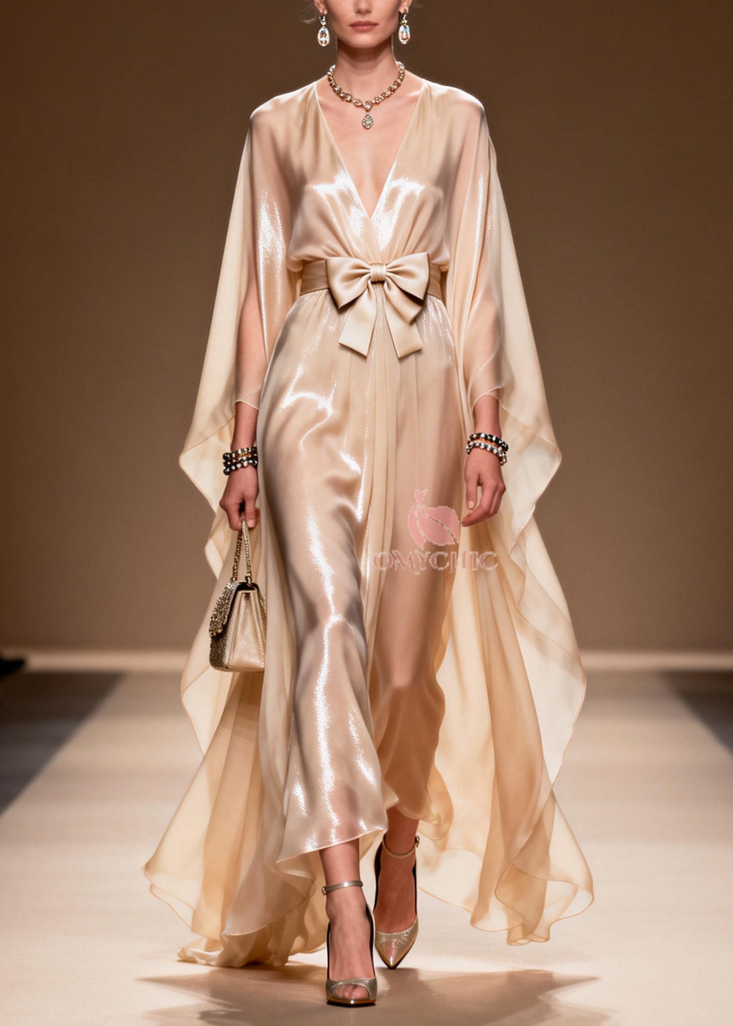 French Khaki Bow Exra Large Hem Chiffon Dinner Dresses Summer