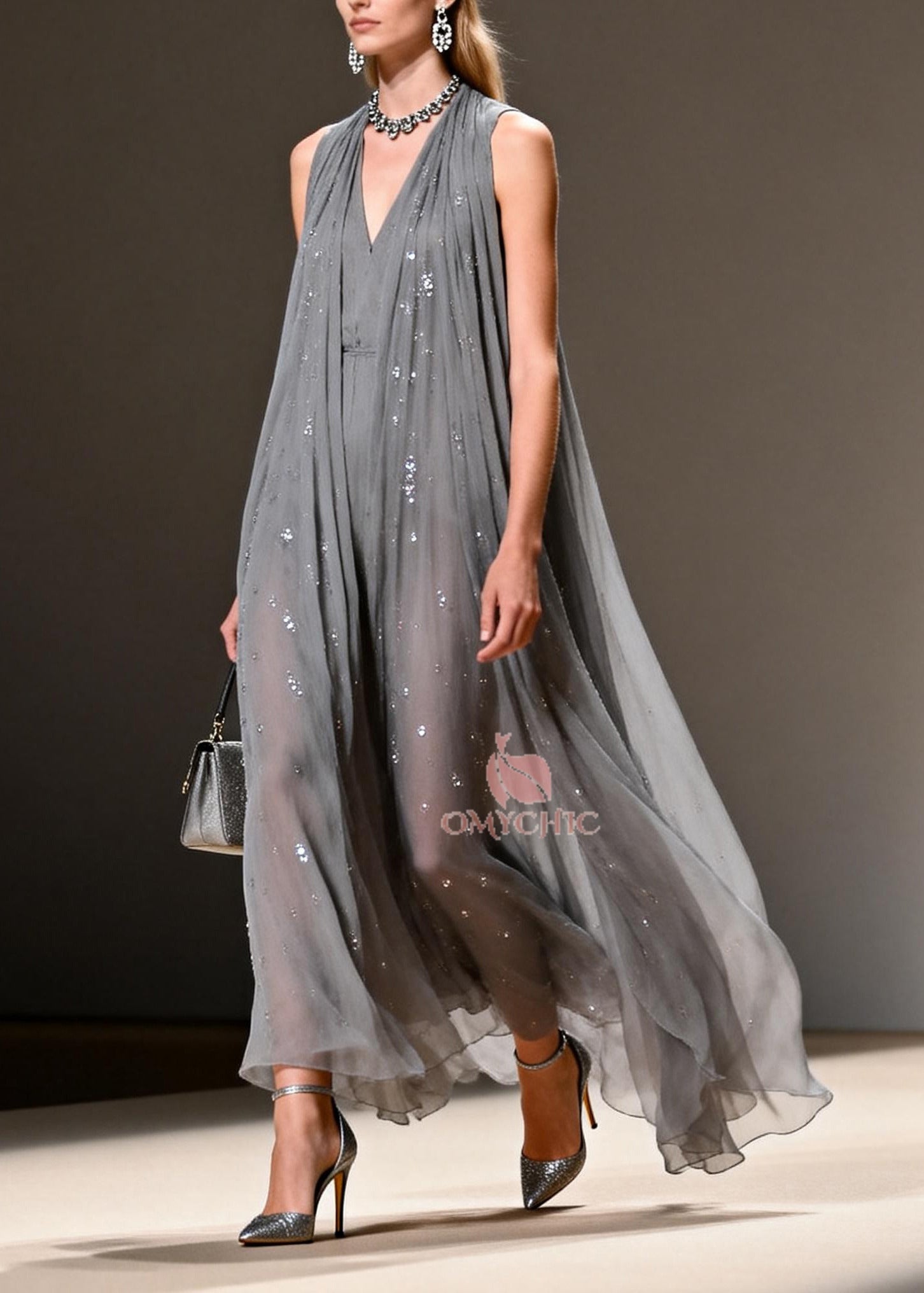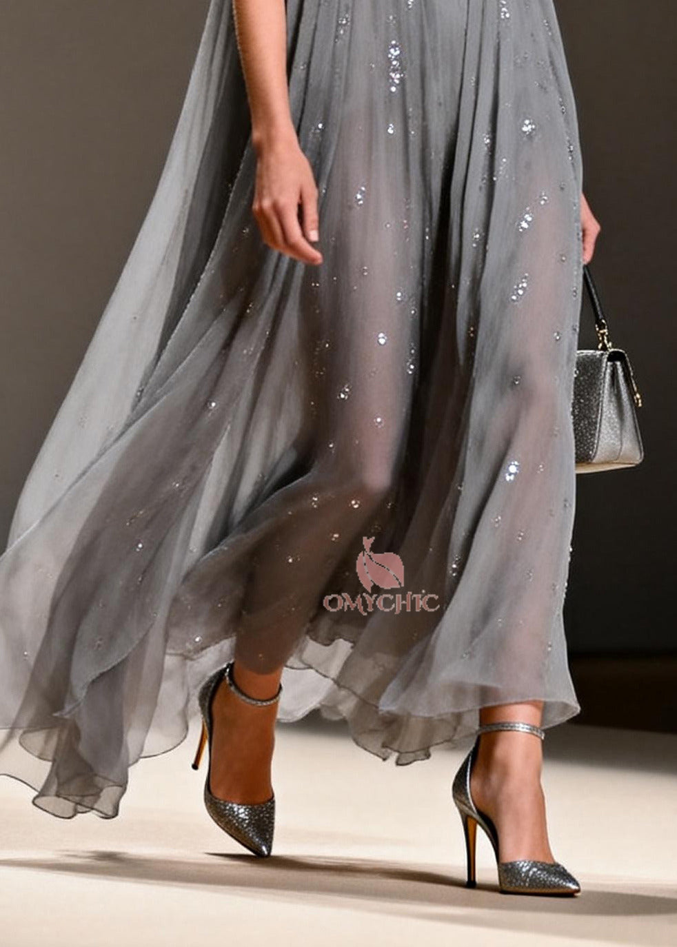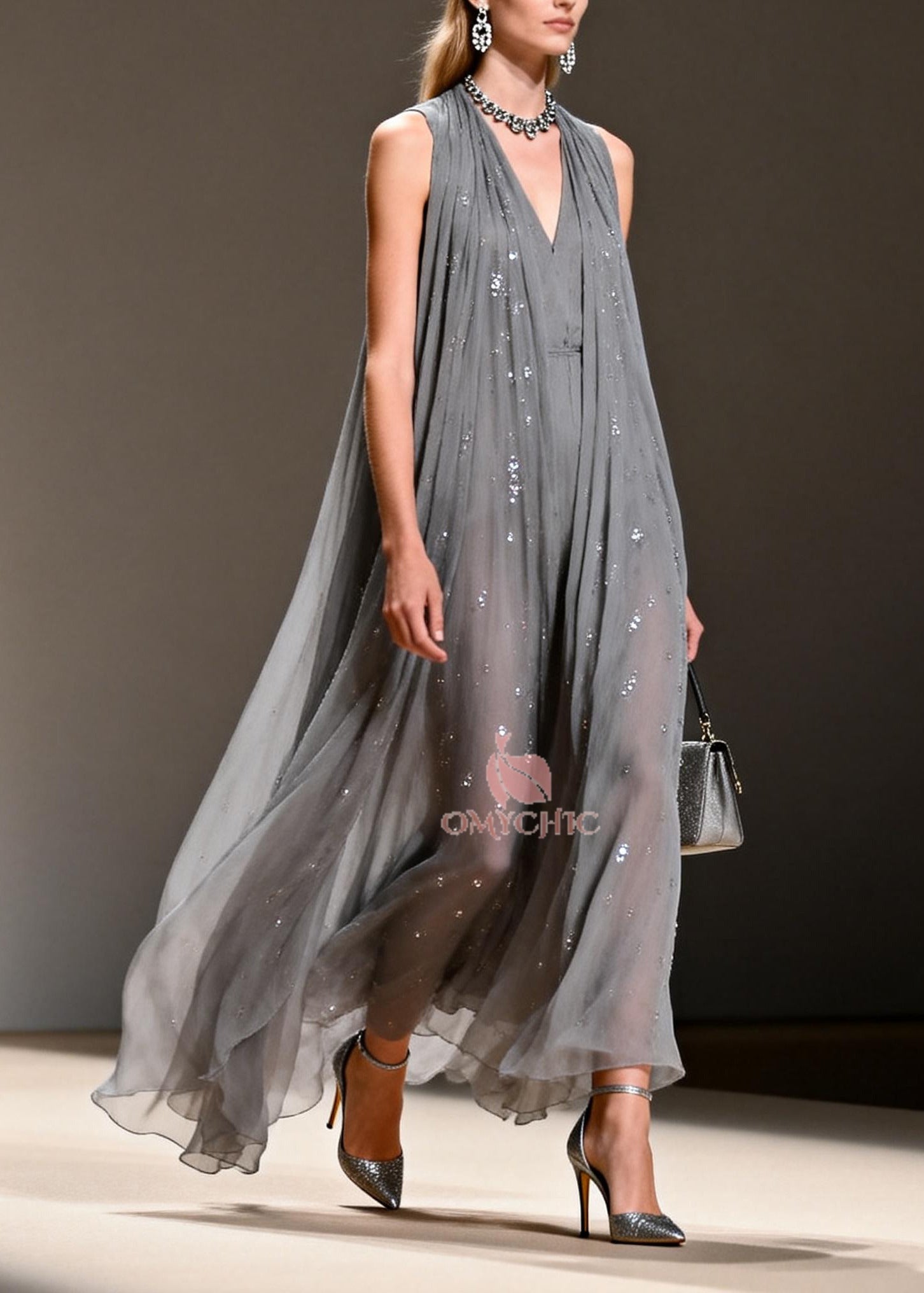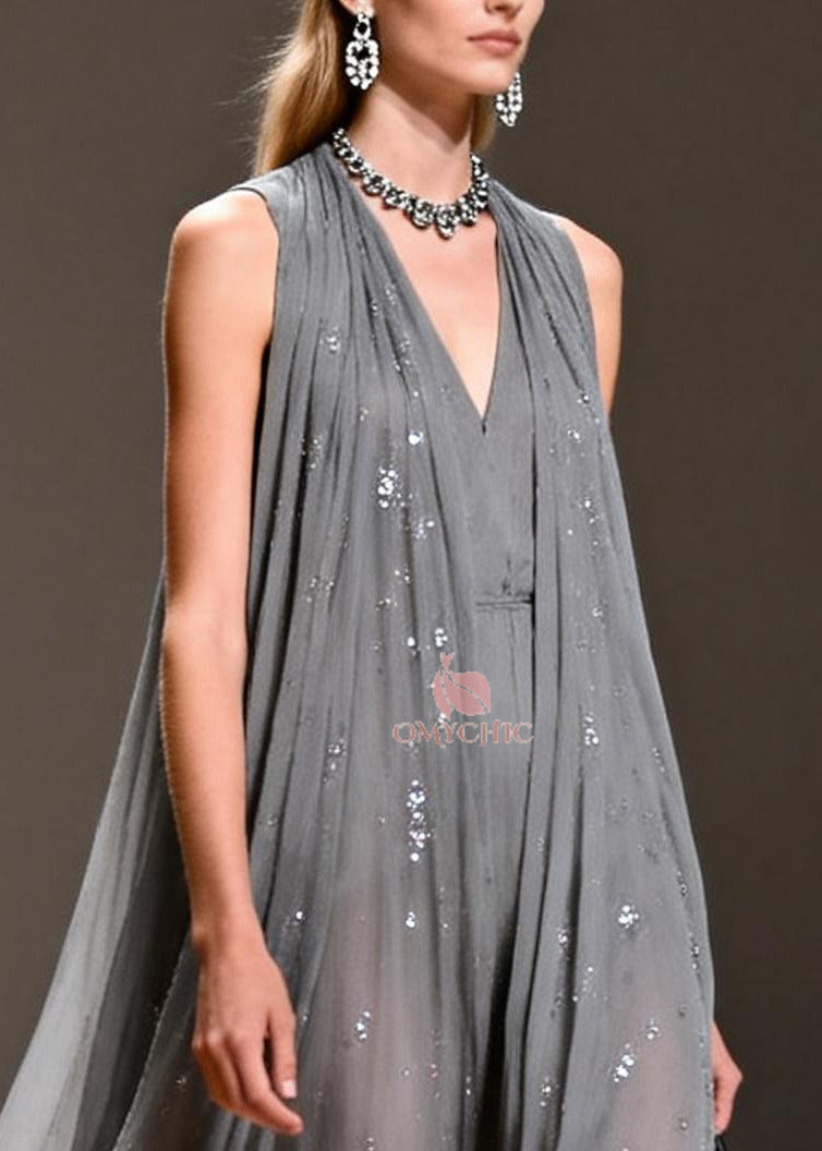 Women Grey Sequins Chiffon Long Dress Sleeveless