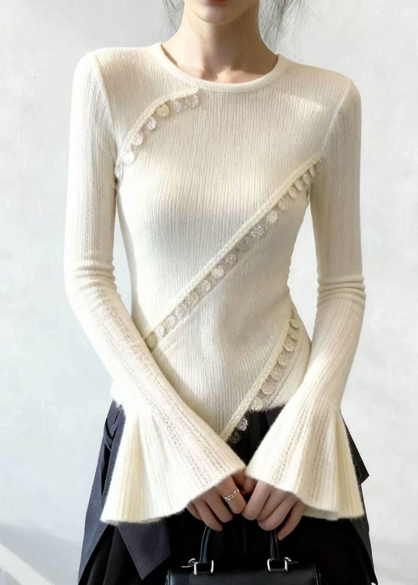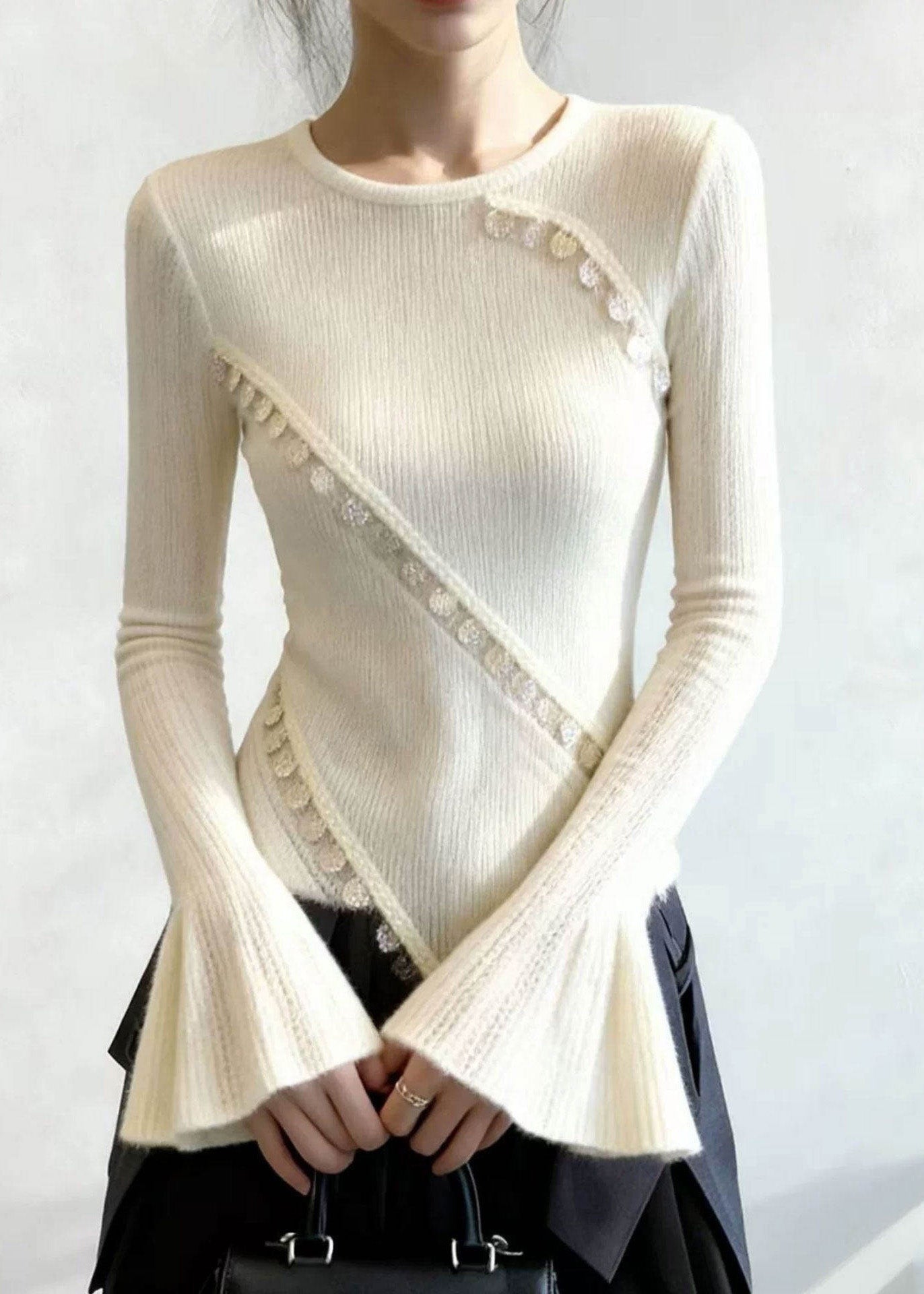 French White O Neck Patchwork Knit Sweater Top Flare Sleeve