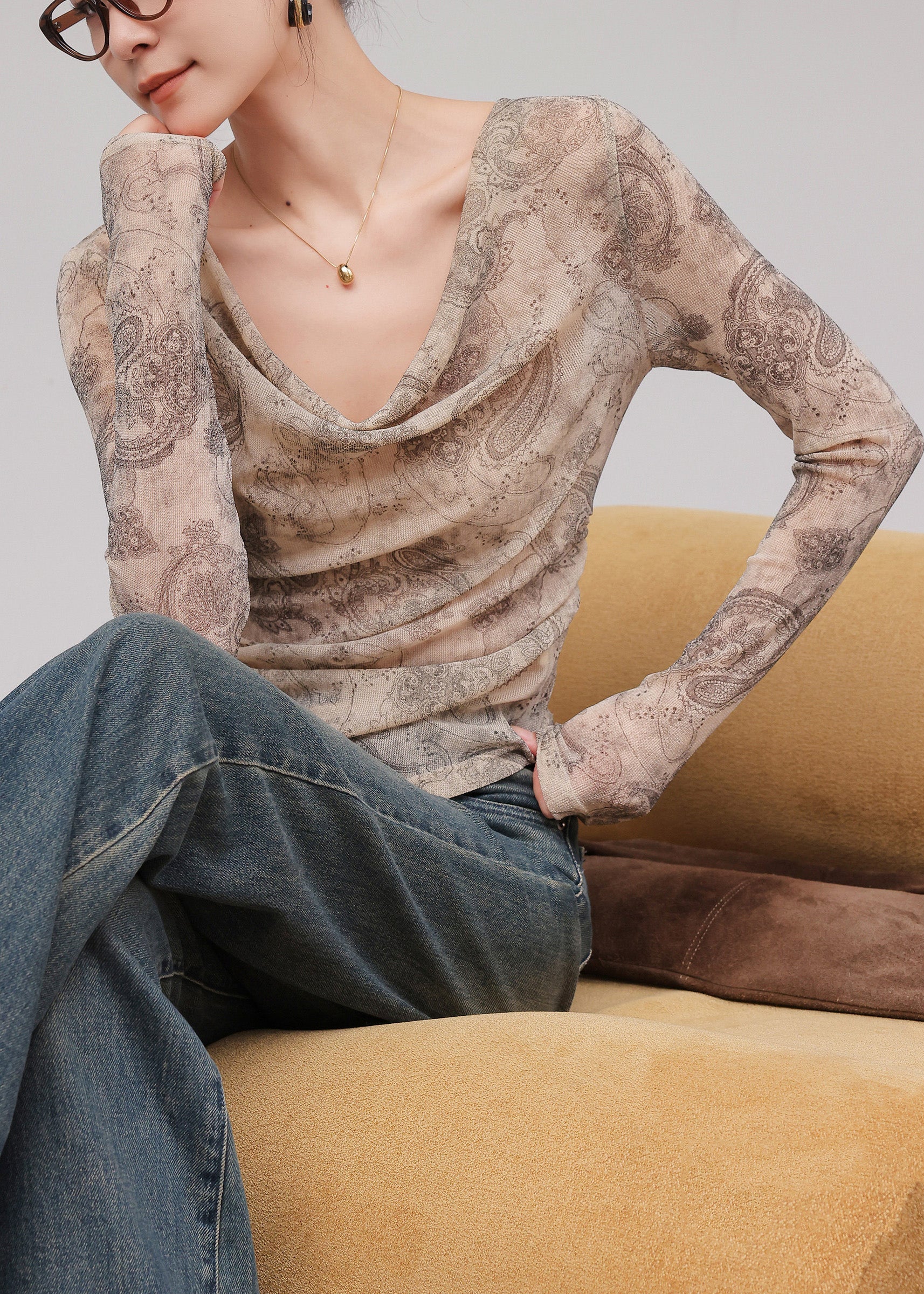 Spring New Beige Print Long Sleeved Draped Neckline T-Shirt