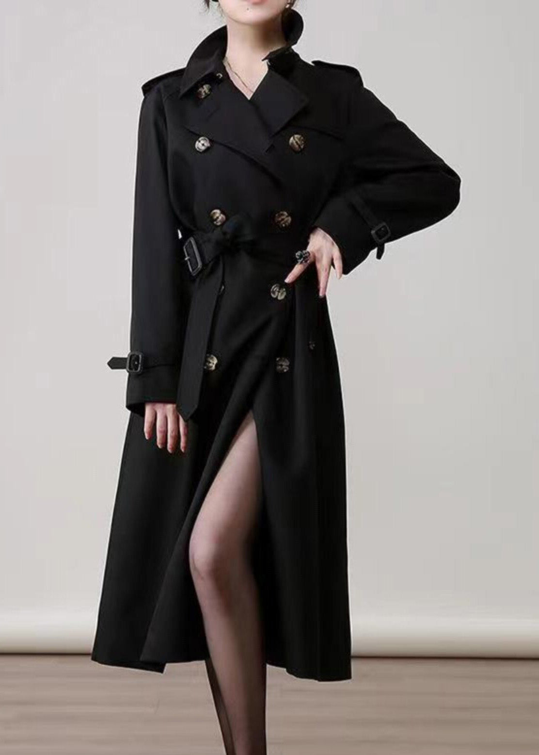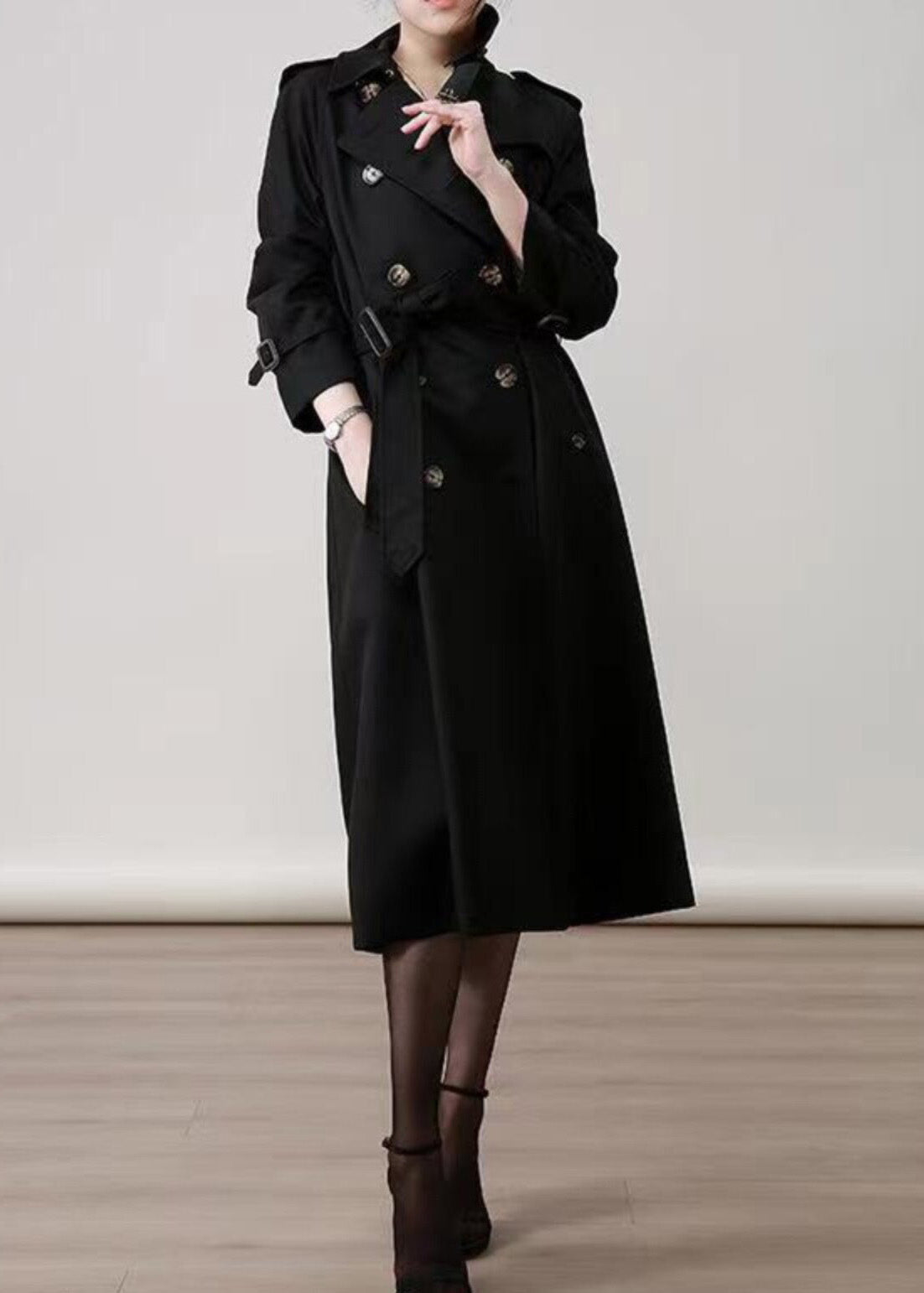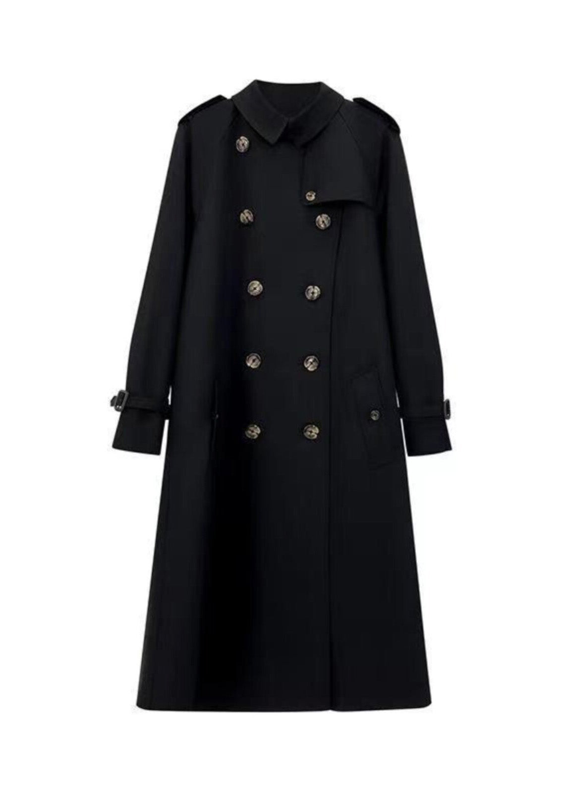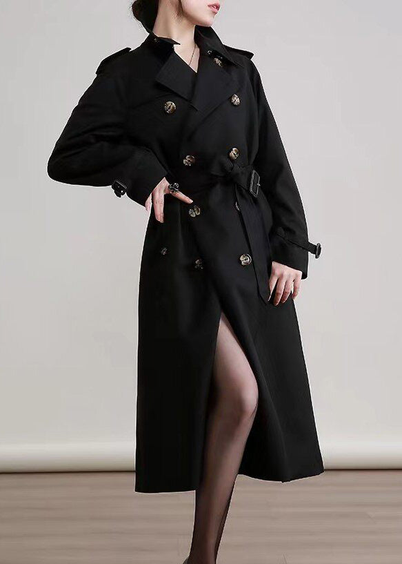 Women Black Peter Pan Collar Double Breast Cotton Trench Spring