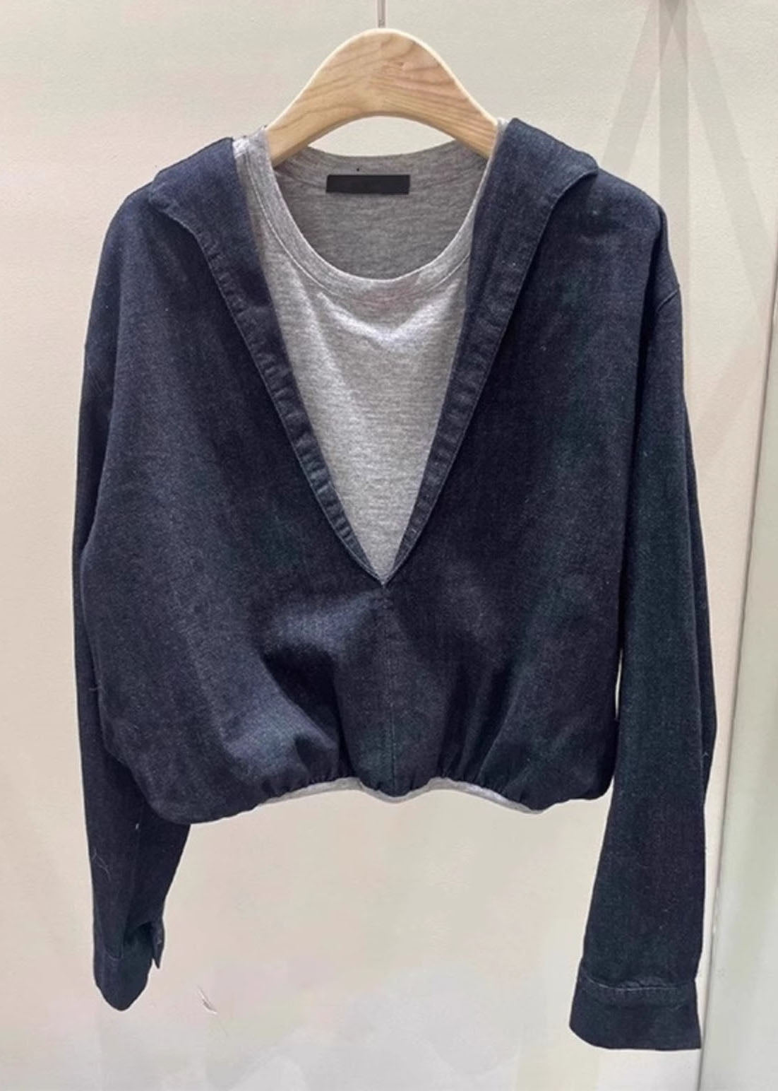 Chic Navy O Neck Patchwork False Two Pieces Cotton Top Spring