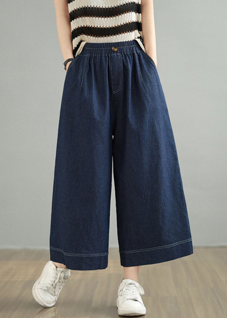 Loose Blue Pockets Elastic Waist Denim Crop Pants Spring