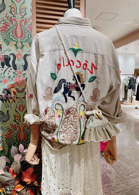 Unique Beige Peter Pan Collar Embroidered Cotton Jacket Spring