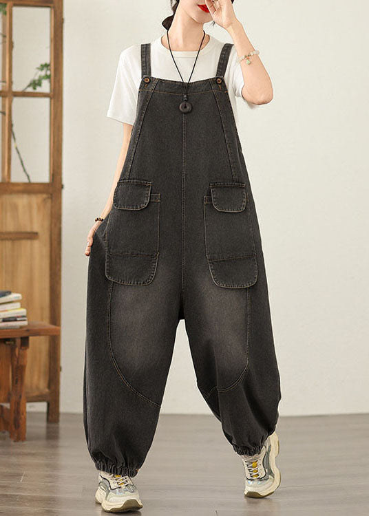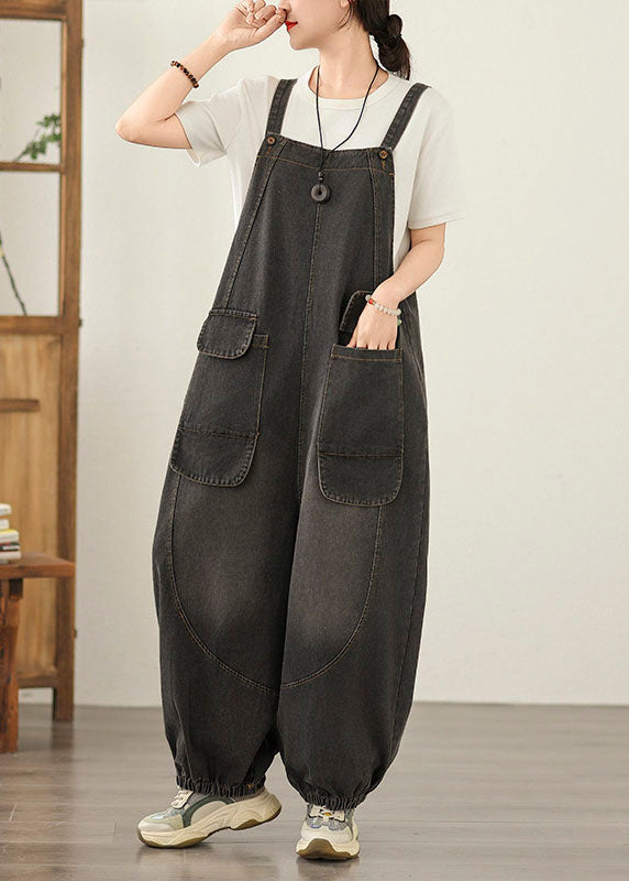 Unique Black Pockets Loose Denim Jumpsuit Spring