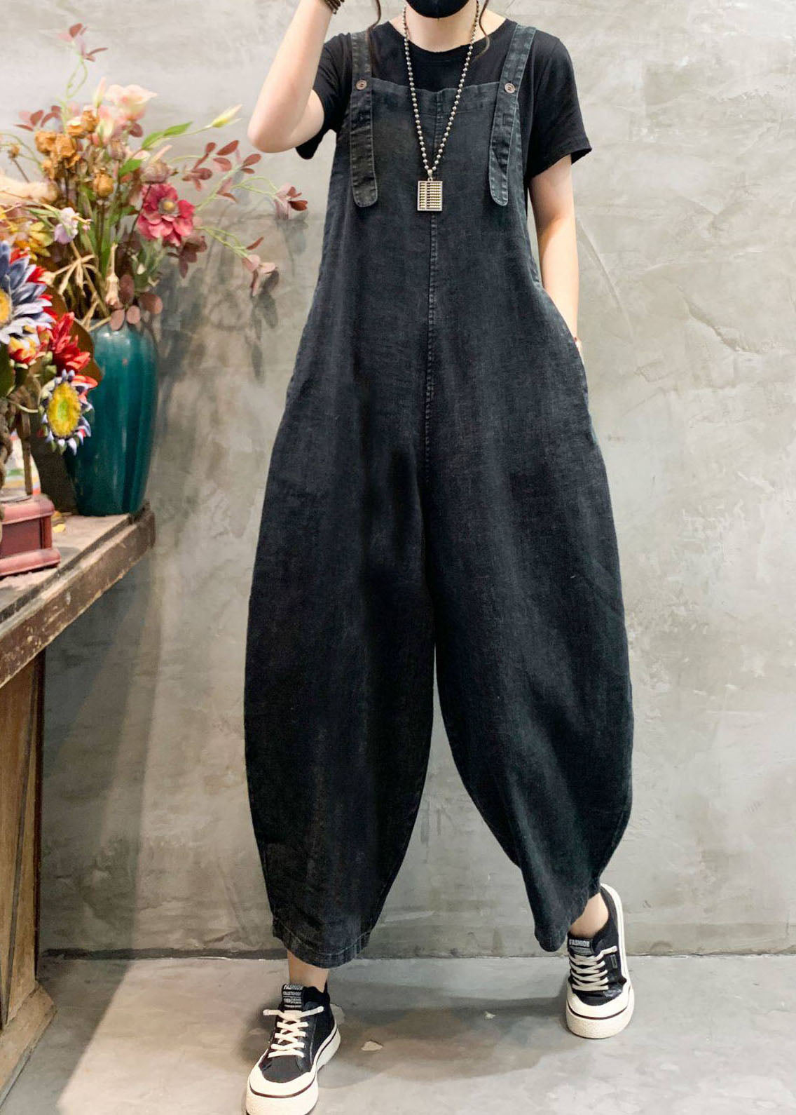Women Black Pockets Plus Size Denim Jumpsuits Summer