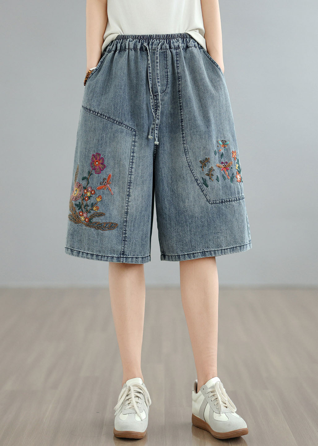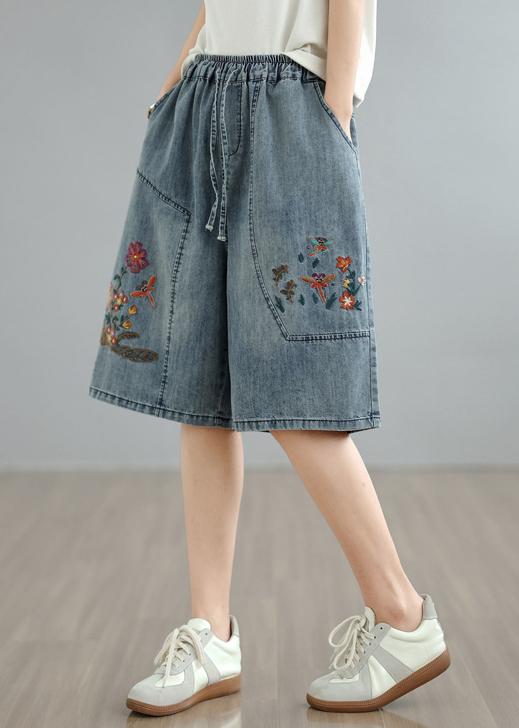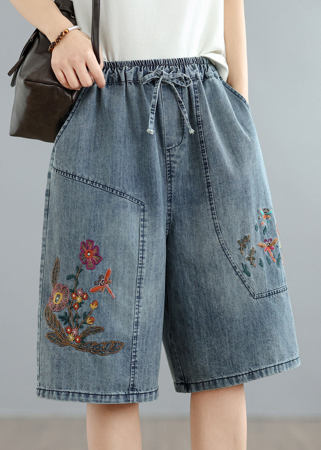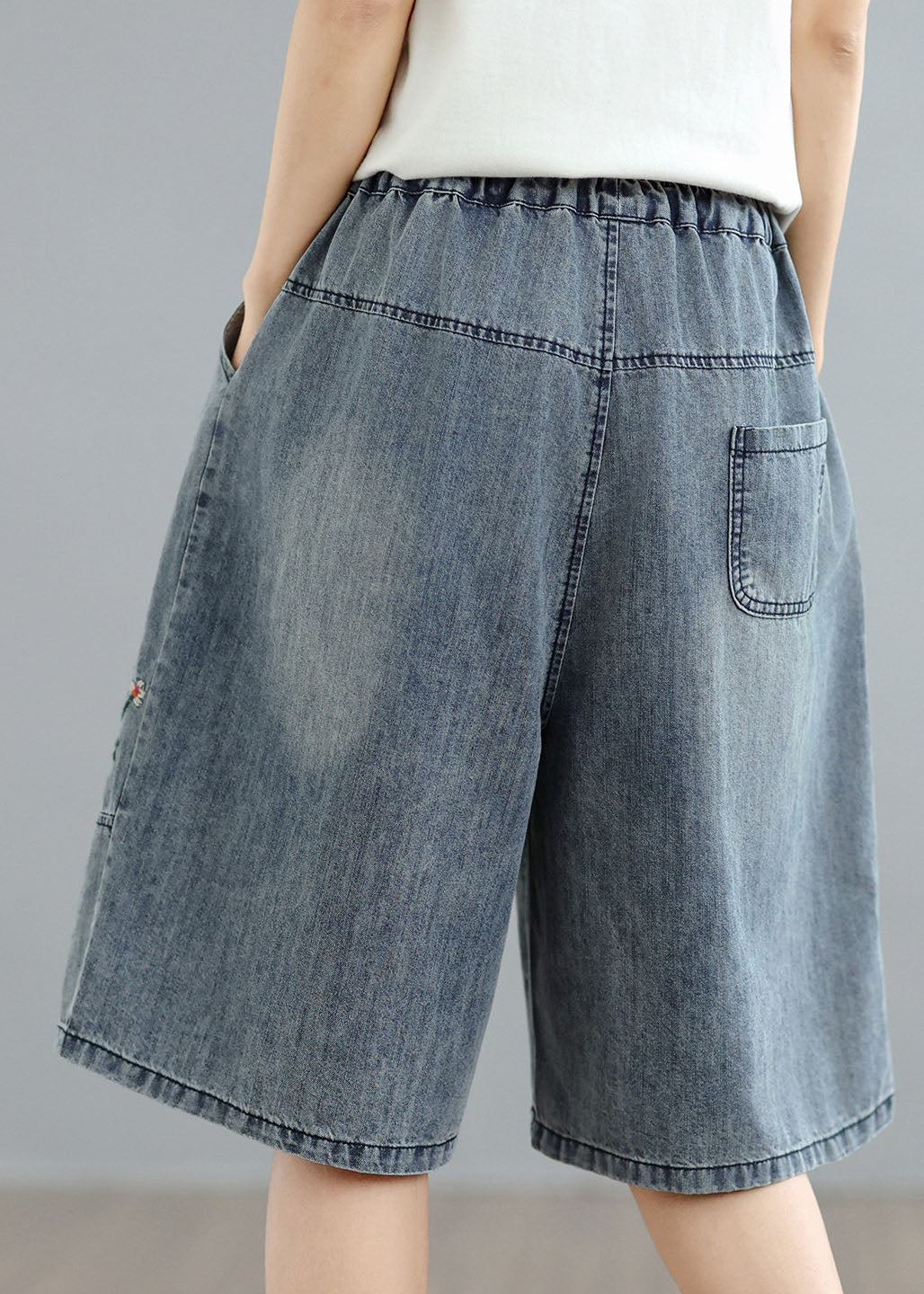 Women Blue Embroidered Pockets Denim Shorts Summer