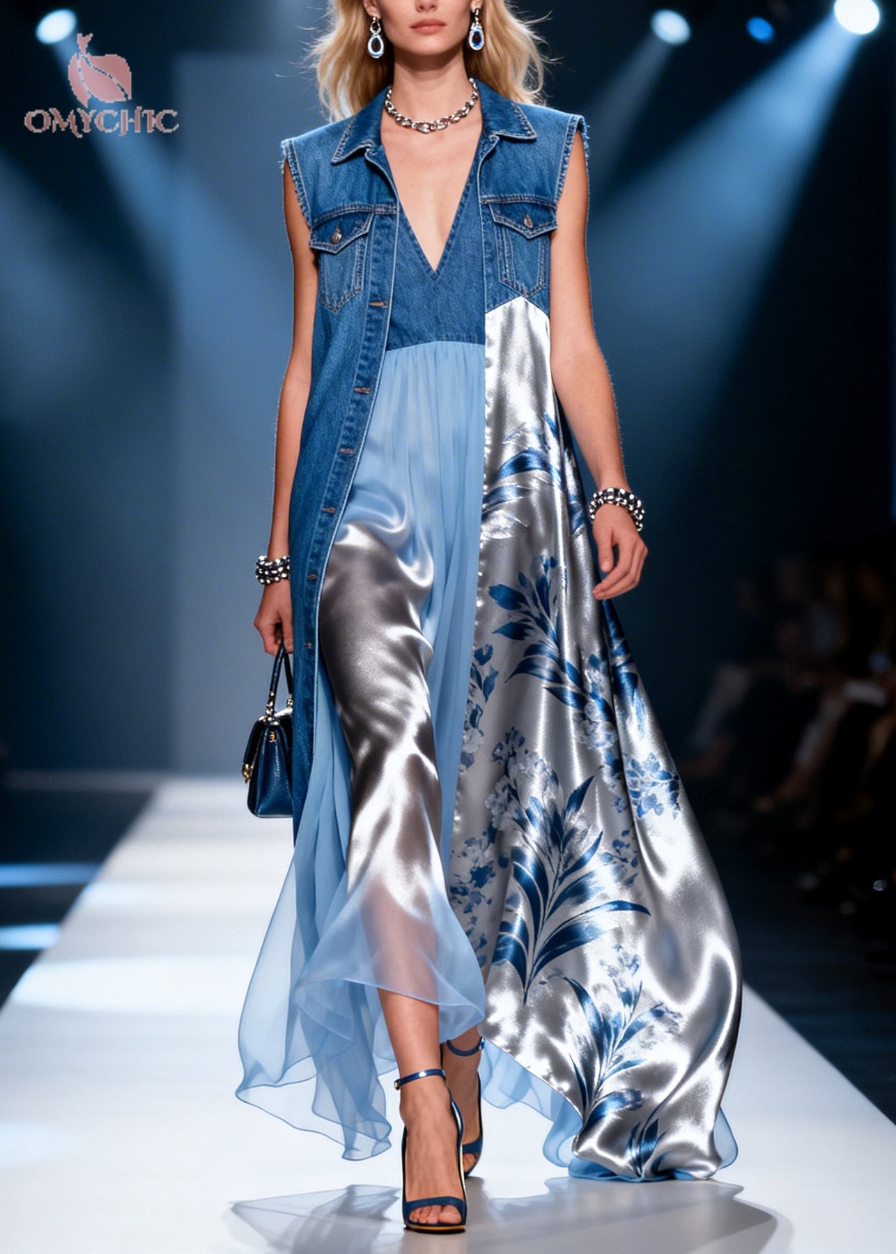 Denim Blue Patchwork Chiffon Dress Two Piece Set Asymmetrical Summer