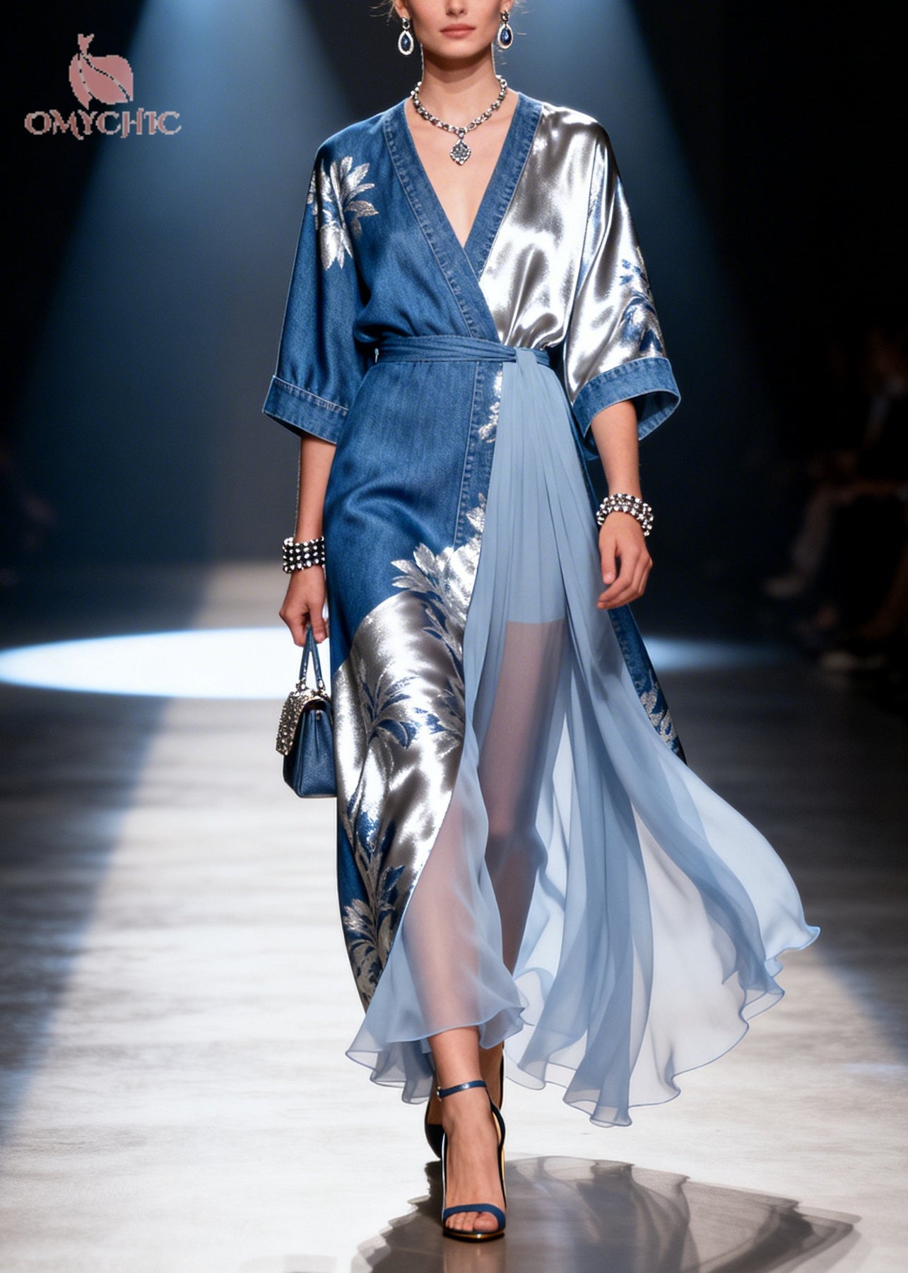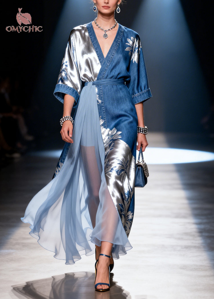 DIY Denim Blue Print Asymmetrical Patchwork Tulle Dress Summer