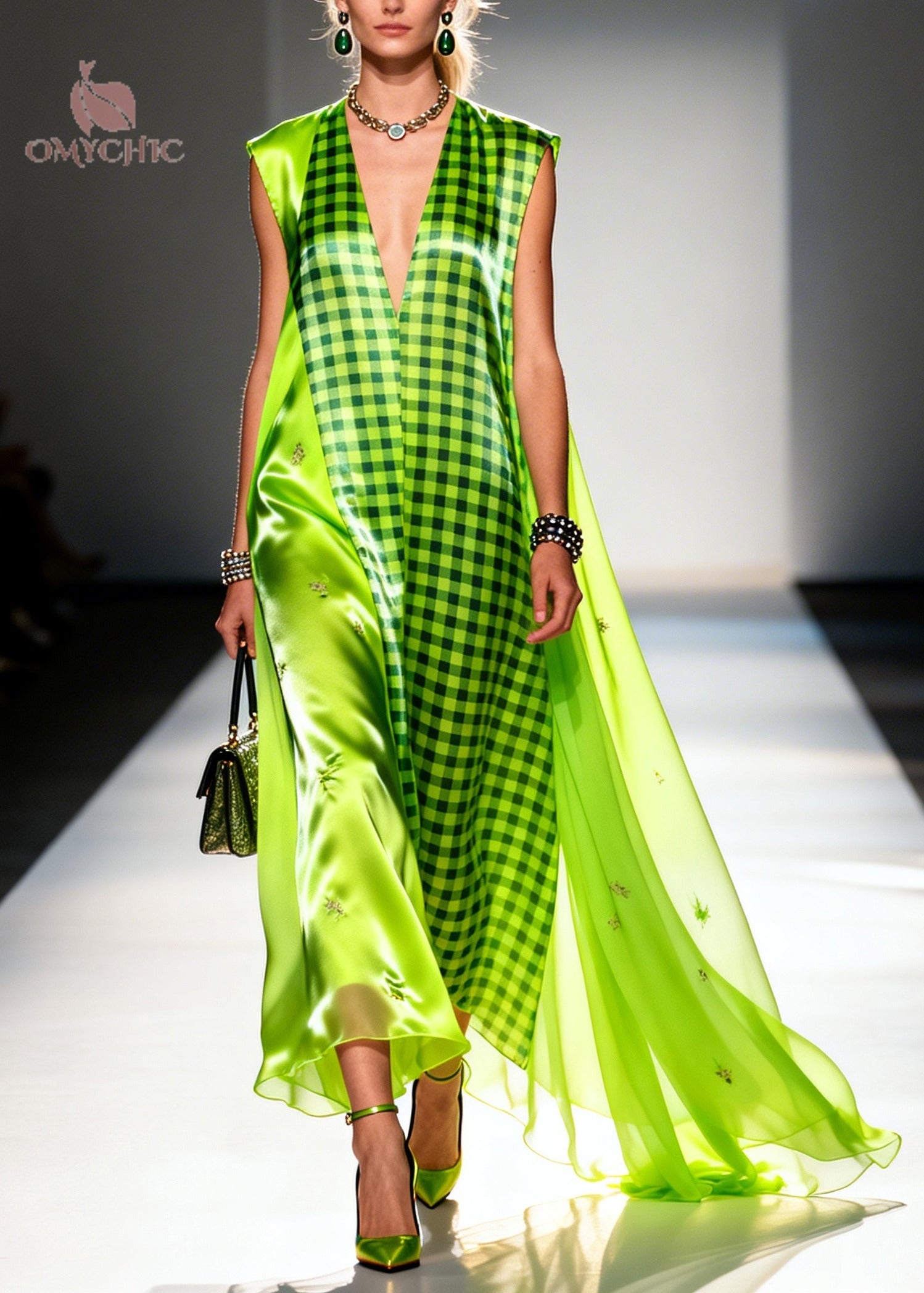 Bohemian Fluorescent Green Plaid Patchwork Silk Ankle Dress Sleeveless