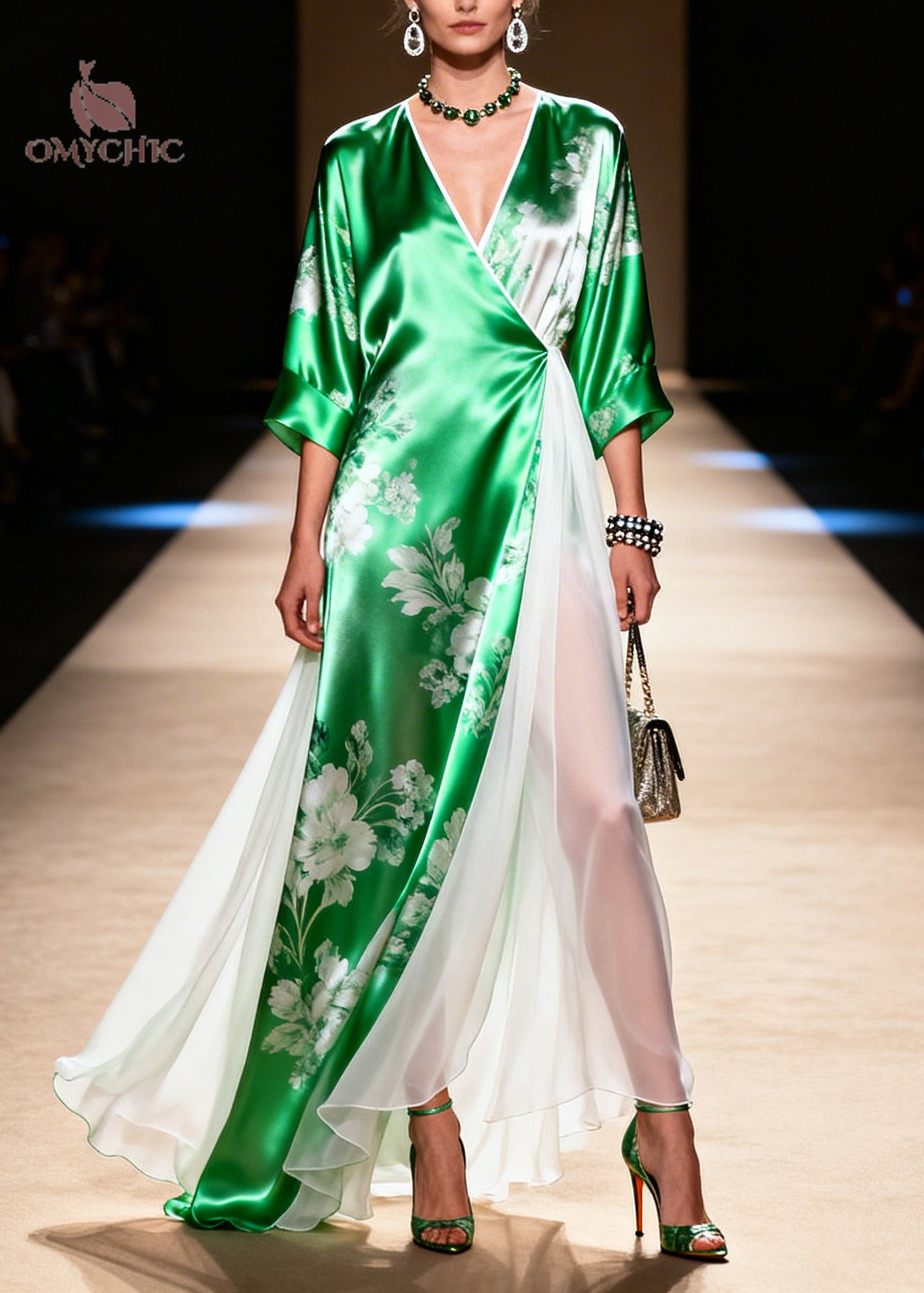 Art Grass Green Print Patchwork Chiffon Robe Dresses Summer