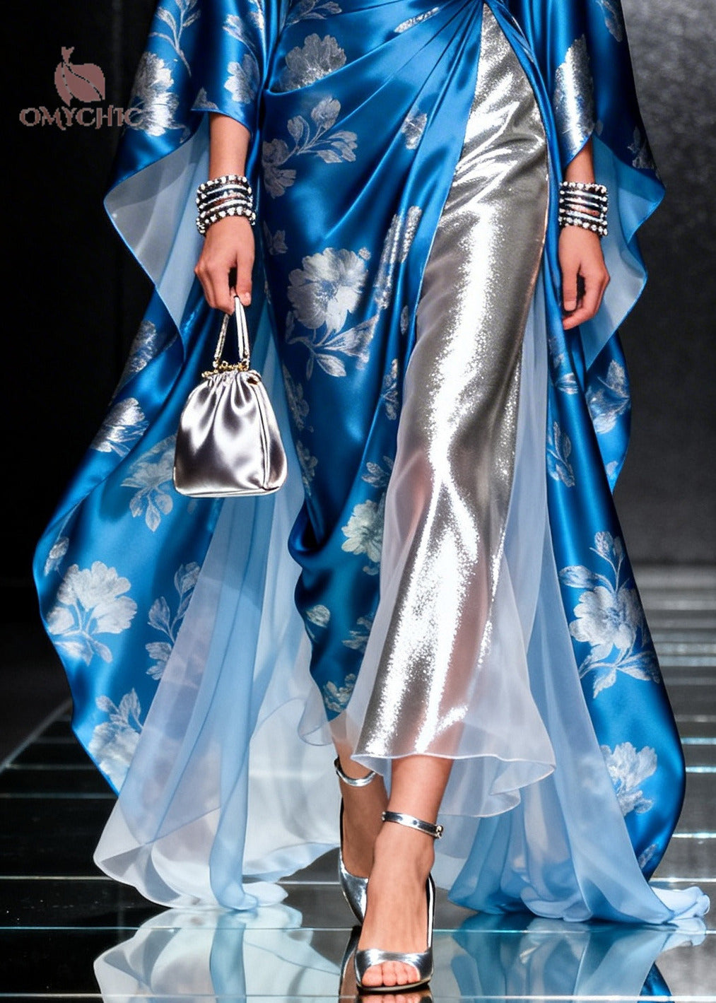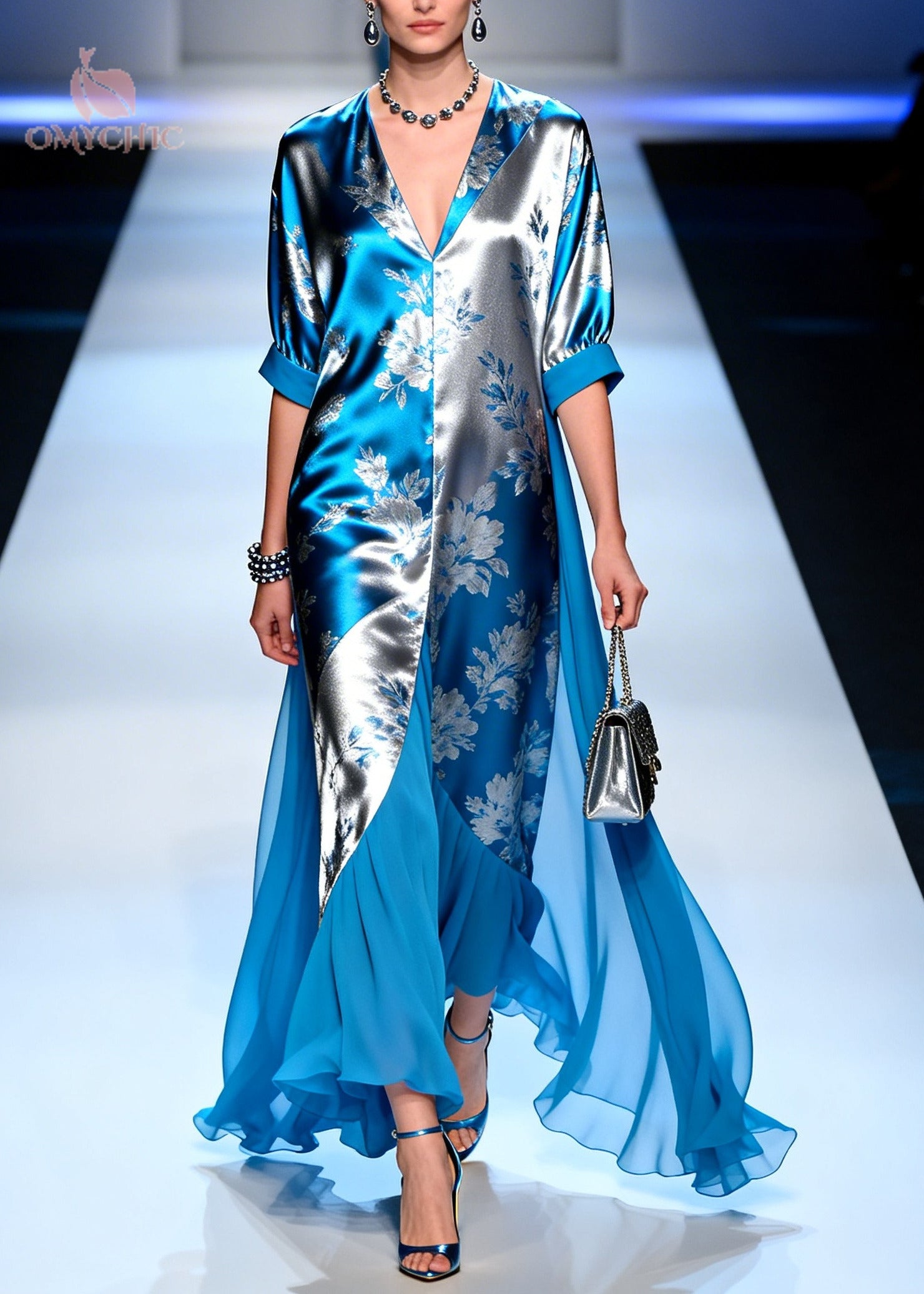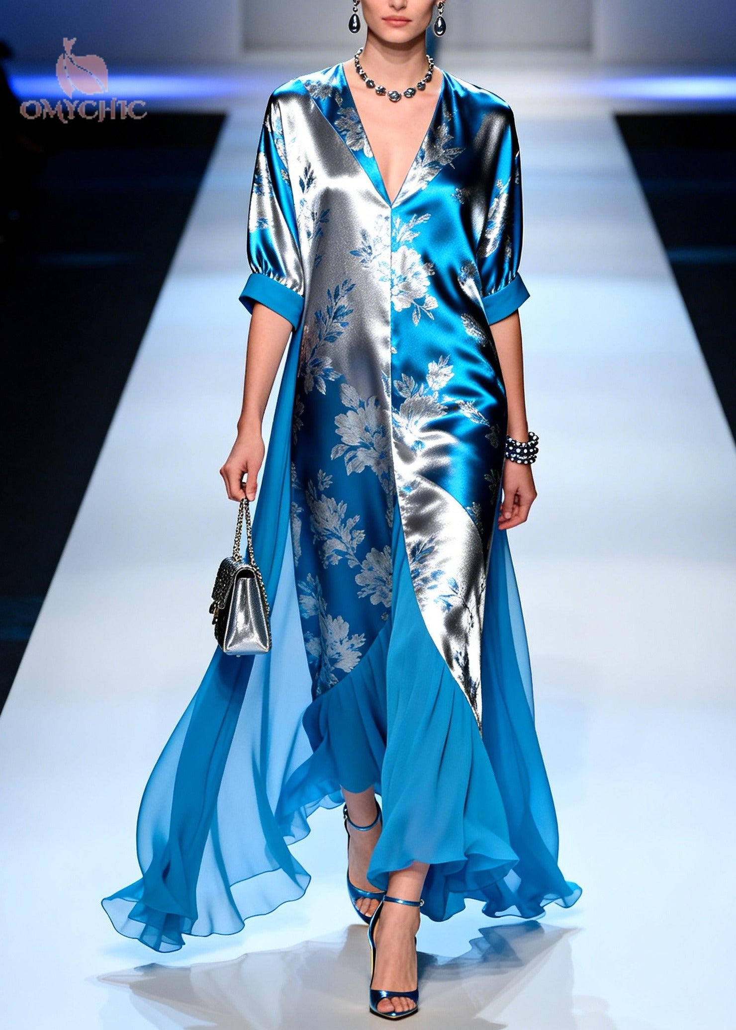 Modern Blue Jacquard Patchwork Draping Silk Maxi Dresses Summer