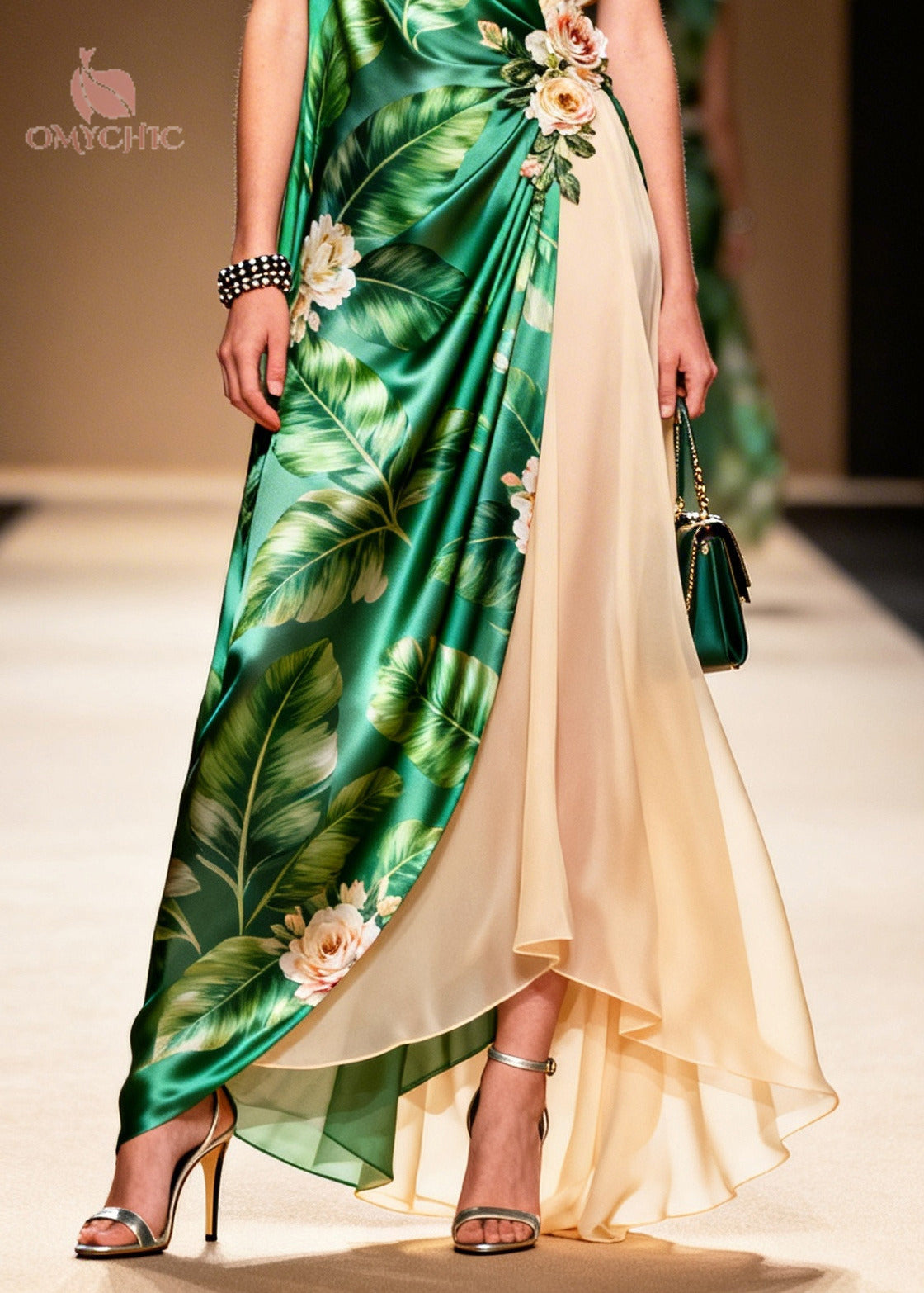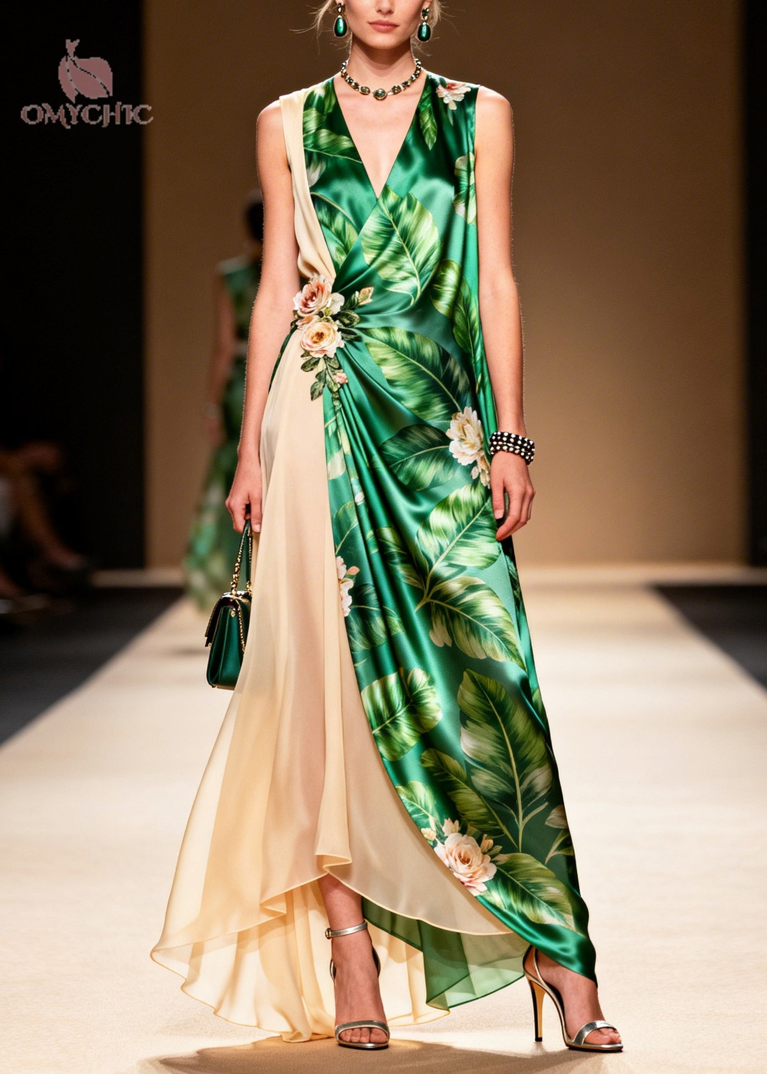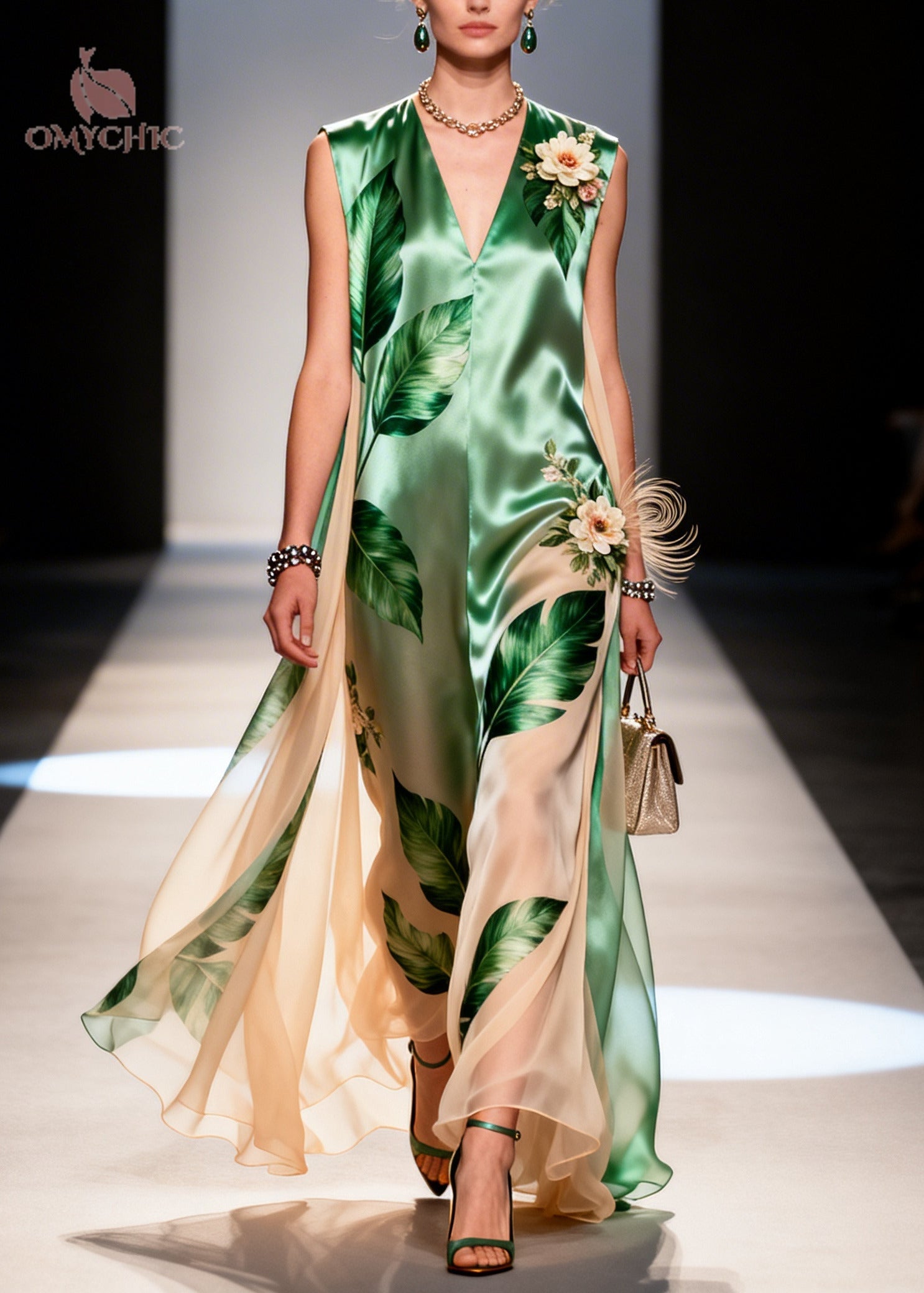 Elegant Green Leaf Print Handmade Flower Chiffon Dresses Sleeveless