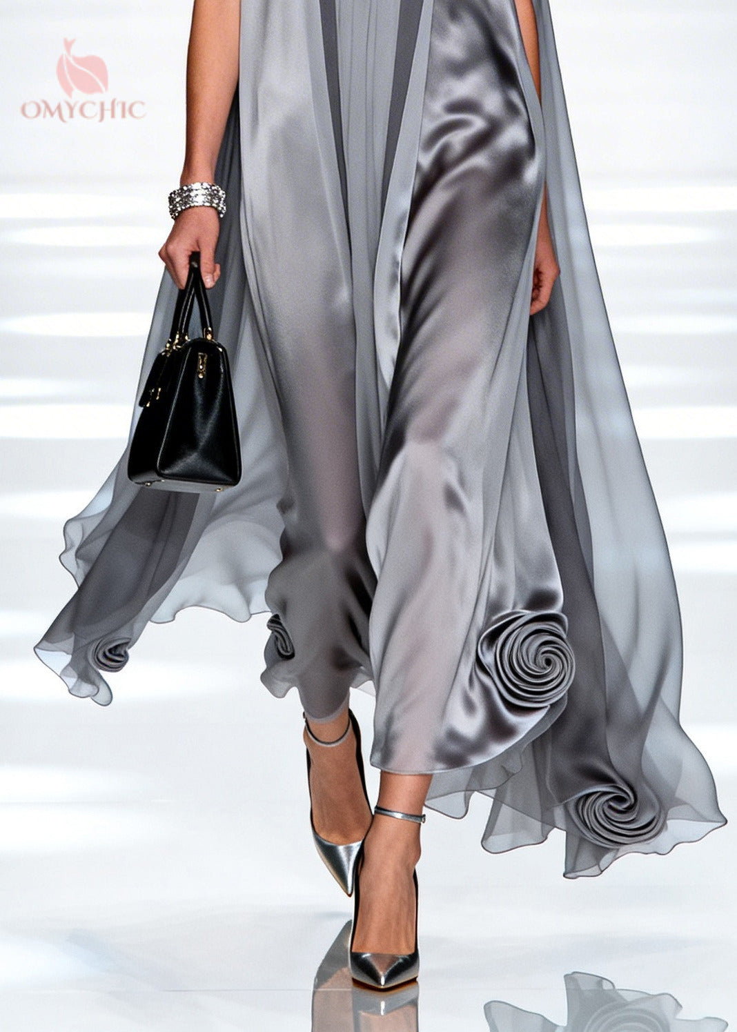 Loose Grey Oversized Stereoscopic Floral Chiffon Long Dress Sleeveless