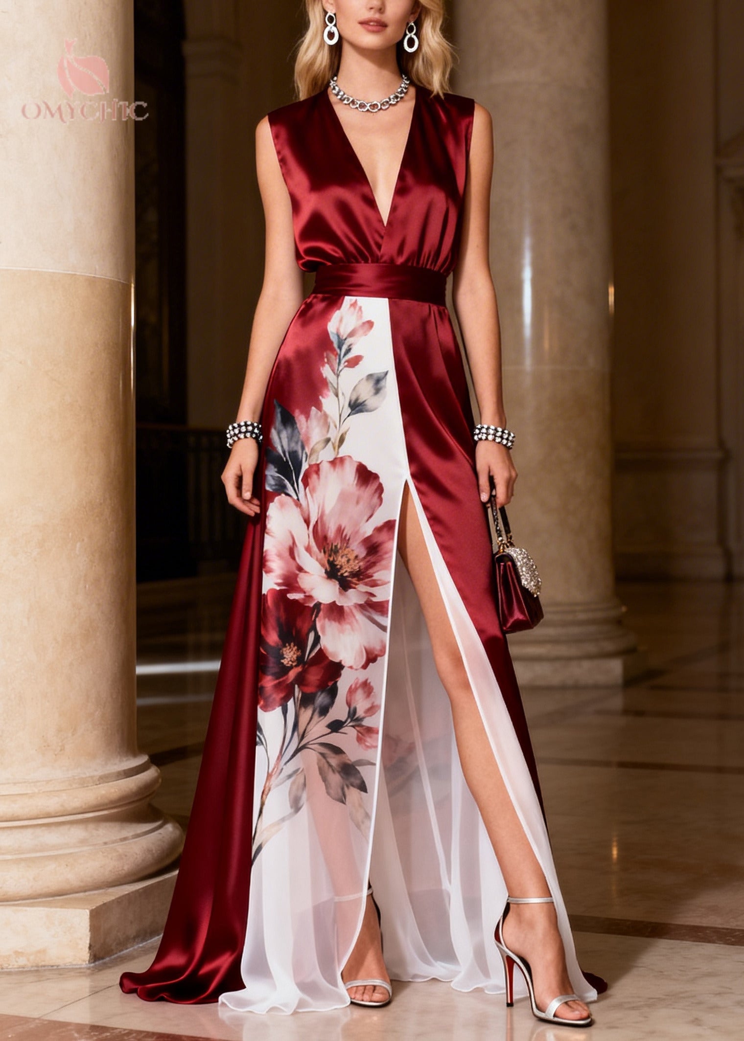 Modern Mulberry V Neck Patchwork Side Open Silk Party Dress Sleeveless
