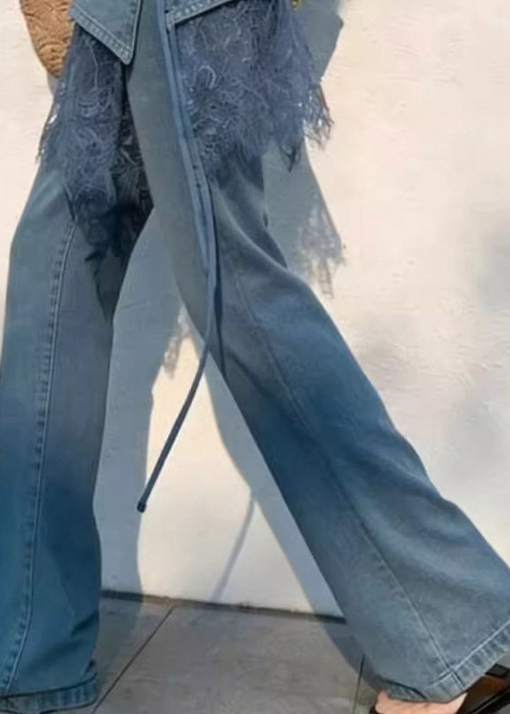 2026 New Blue High Waist Lace Patchwork Straight Jeans Summer