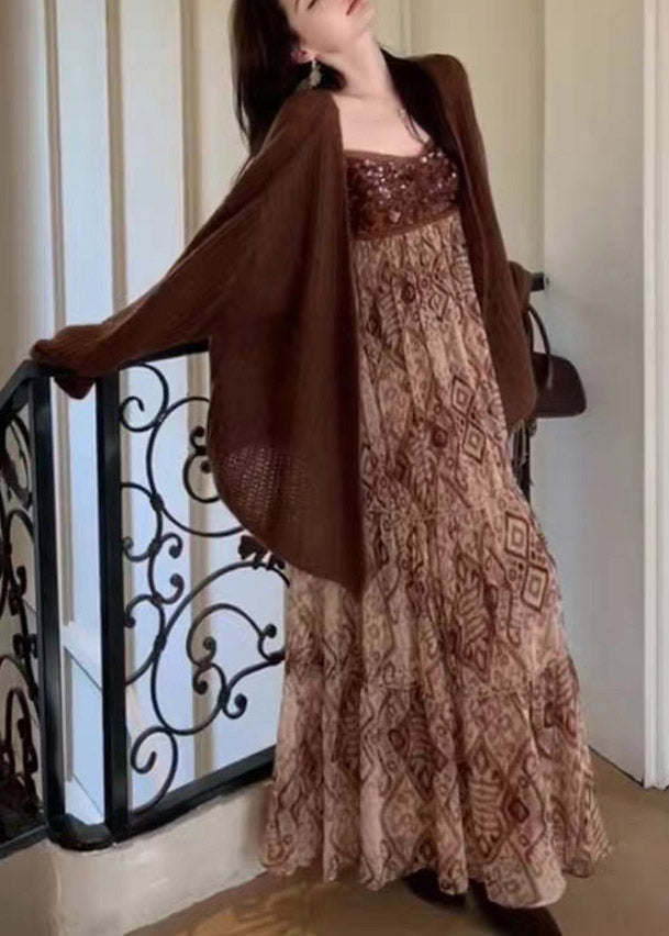 Casual Brown V Neck Knit Cardigans And Long Spaghetti Strap Dress Two Piece Set Spring
