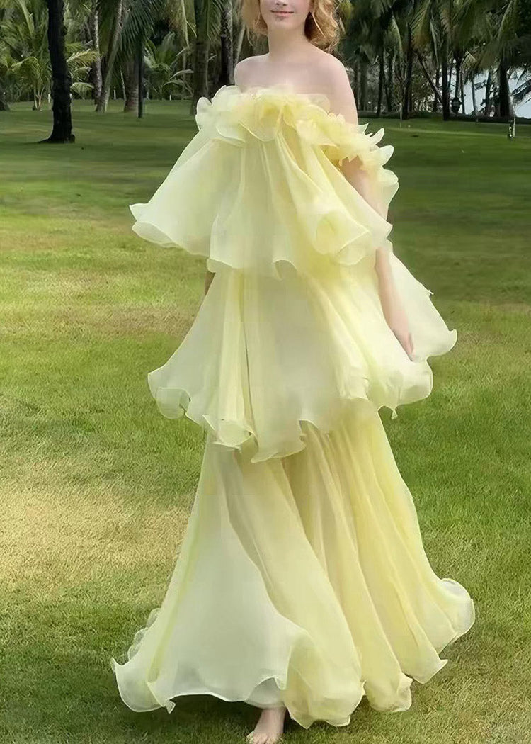 Cute Yellow Slash Neck Ruffled Patchwork Tulle Maxi Dress Sleeveless