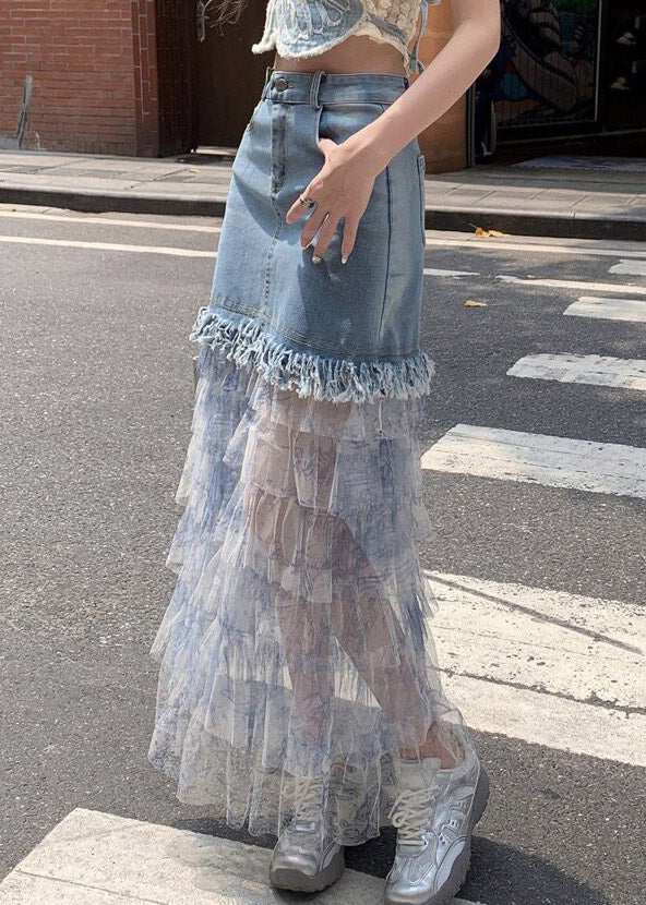Women Blue Denim Patchwork Tulle Maxi Cake Skirts Summer