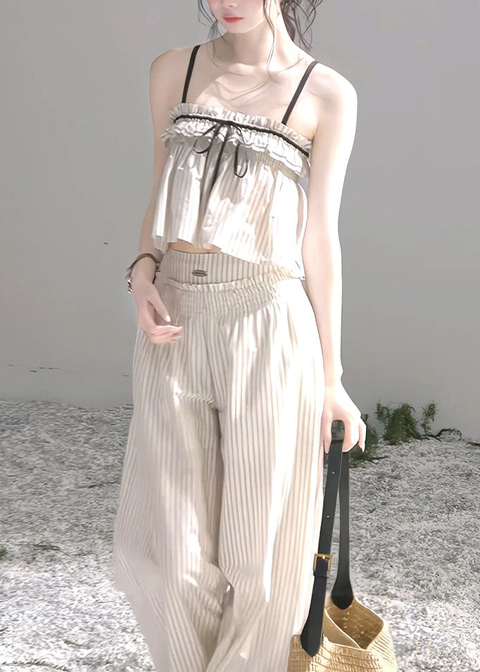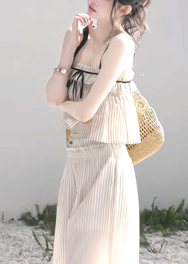 Modern Beige Ruffled Striped Cotton Bow Women Sets 2 Pieces Summer