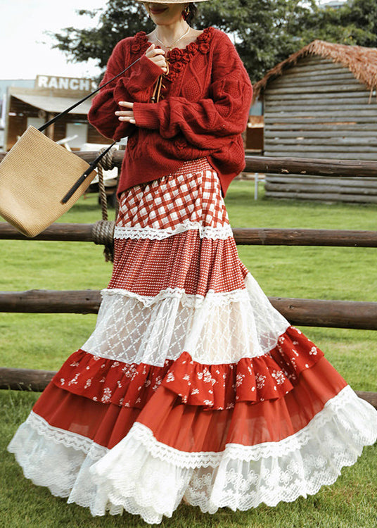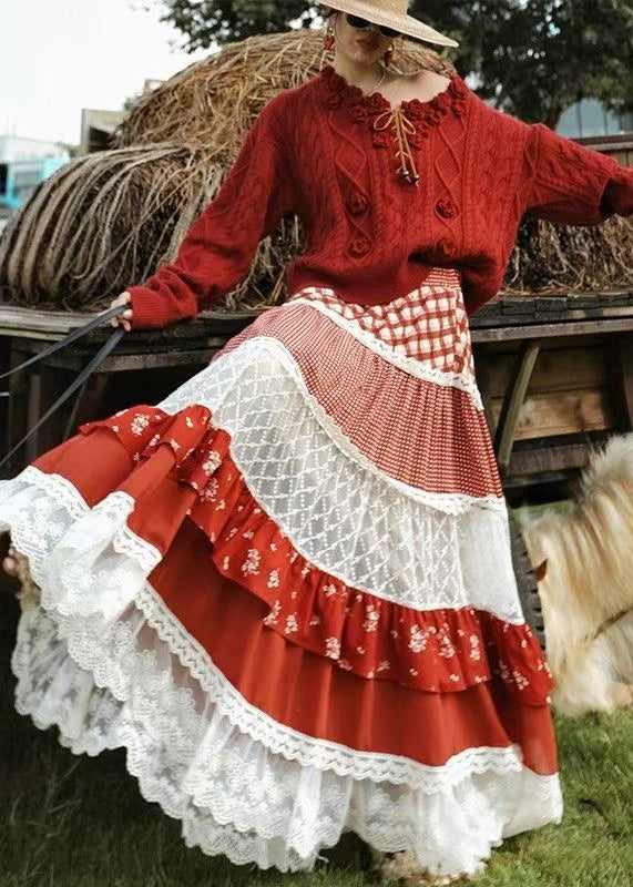 Modern Red Exra Large Hem Patchwork Lace Holiday Skirts Spring