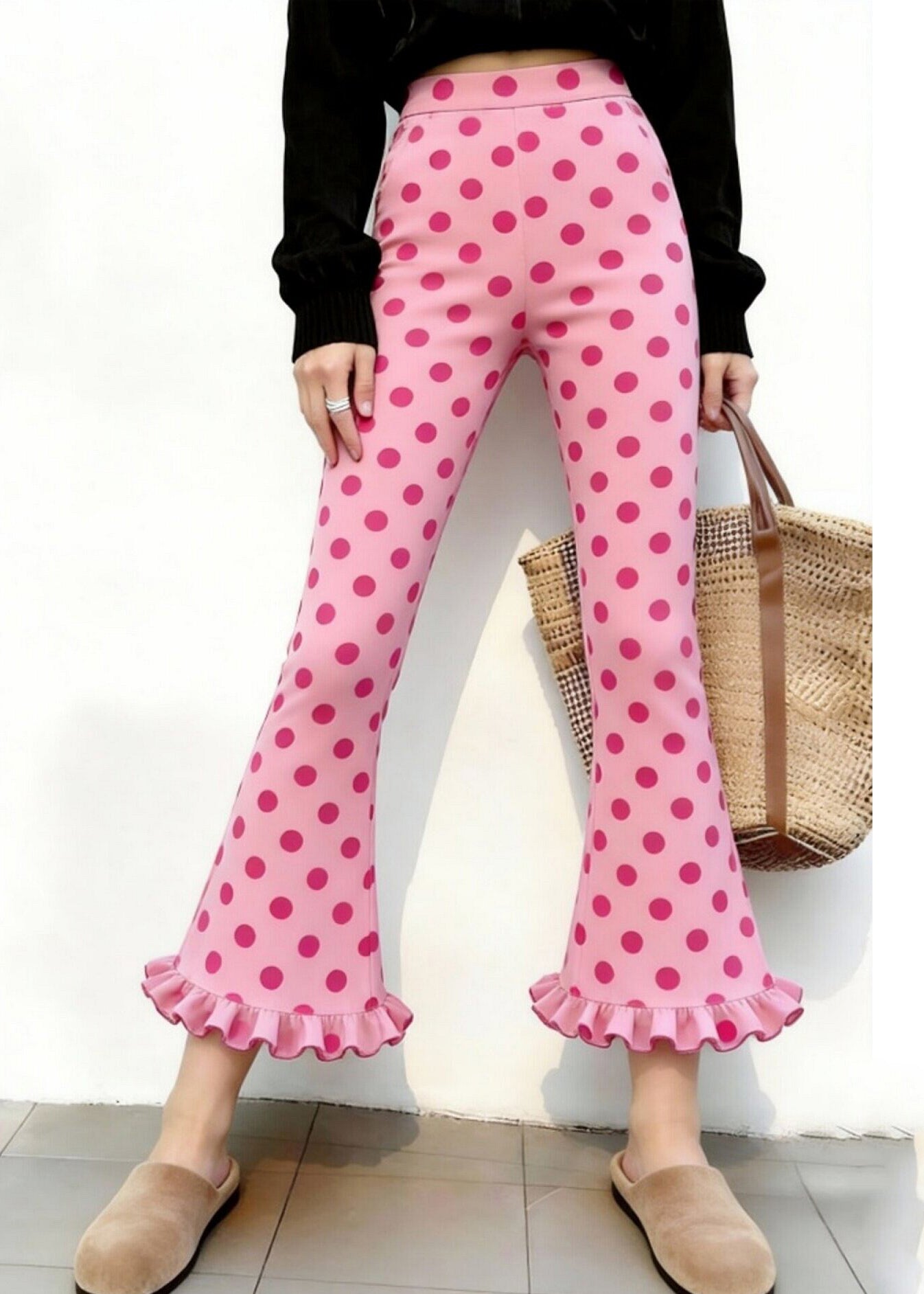 Organic Pink Ruffled Print Cotton Bell-bottom Trousers Summer