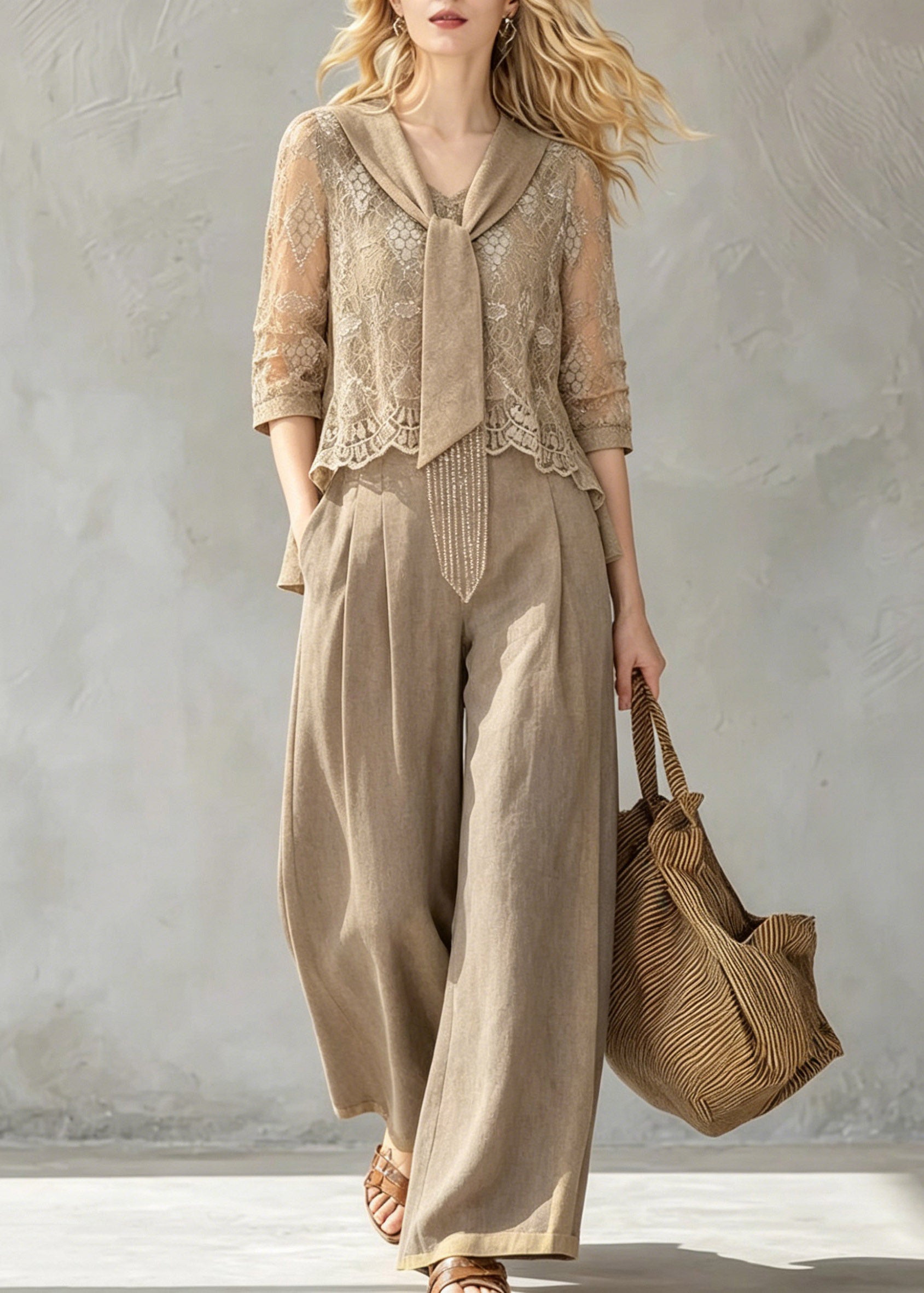2026 New Khaki Bow Lace Top And Wide Leg Pants Two Pieces Set Half Sleeve