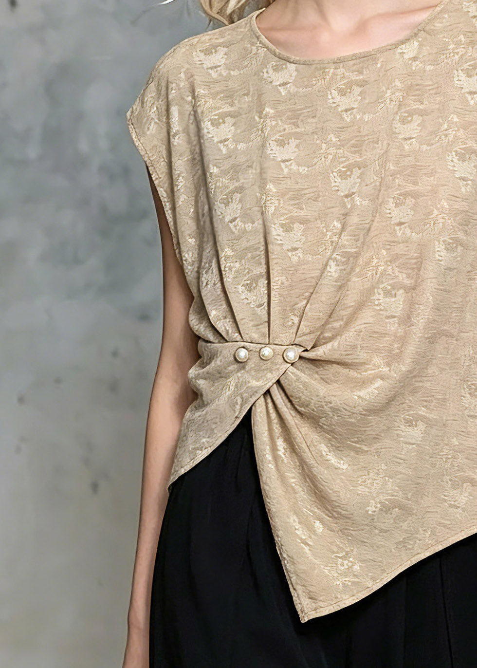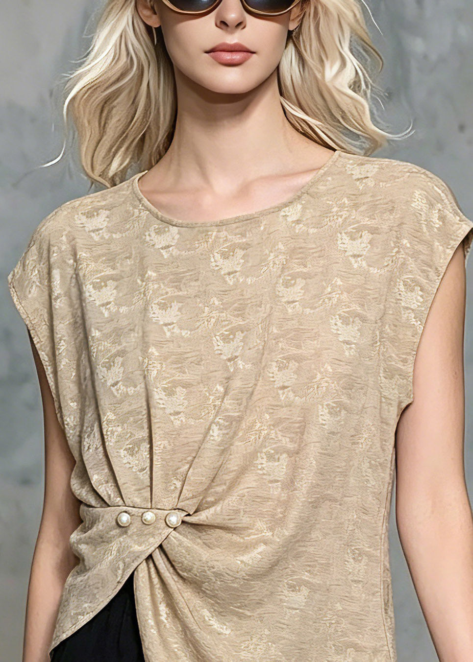Classy Khaki Wrinkled Nail Bead Tops Short Sleeve