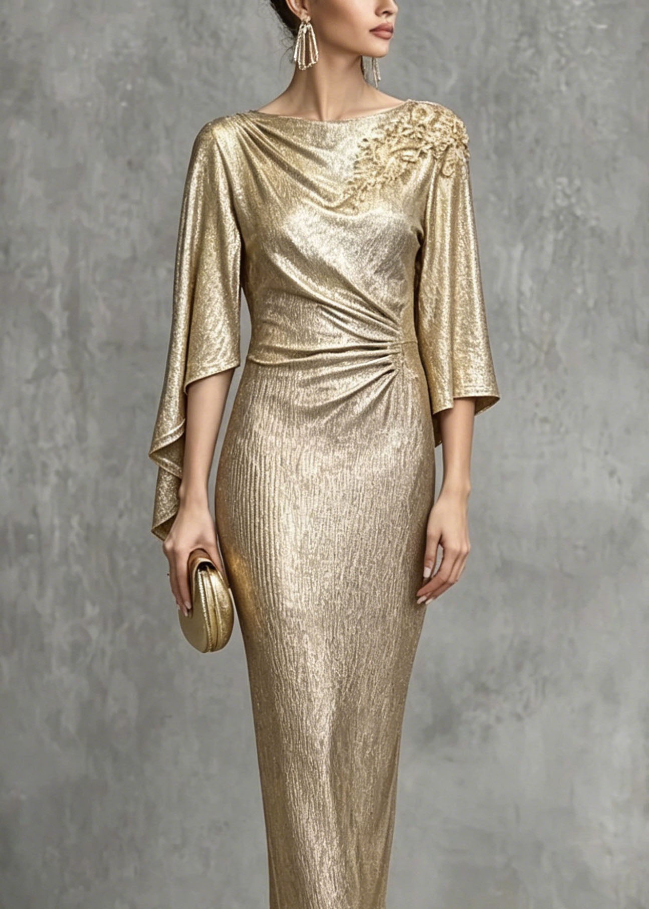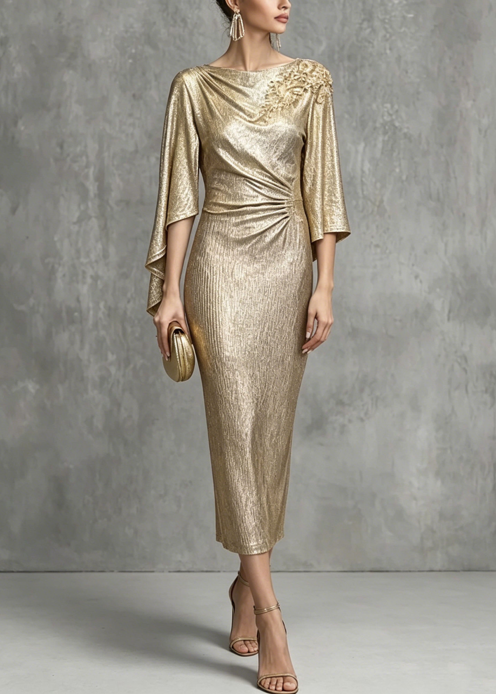Elegant Champagne Asymmetrical Design Zircon Wrinkled Dress Summer