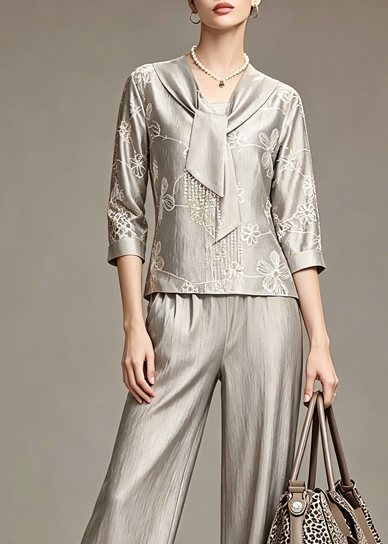 Elegant Grey Print Top And Wide Leg Pants Two Piece Set Spring